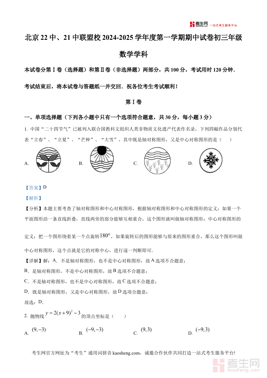《精品解析:北京市第二十二中学、二十一中学联盟校2024-2025学年九年级上学期期中考试数学试题(解析版)》是北京市第二十二中学与二十一中学联盟校针对2024-2025学年九年级上学期数学期中考试推出的专业解析类备考资料,聚焦该阶段数学学科的期中检测需求,为相关教学与学习活动提供针对性支持。