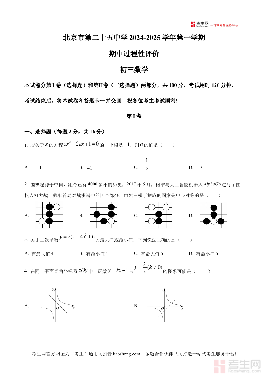 《精品解析:北京市第二十五中学2024-2025学年九年级上学期期中考试数学试卷(10月)(原卷版)》是针对北京市第二十五中学2024-2025学年九年级上学期10月期中考试的数学学科备考资料,涵盖该阶段学校期中检测的原卷内容,为相关人群提供与实际考试直接关联的复习素材。