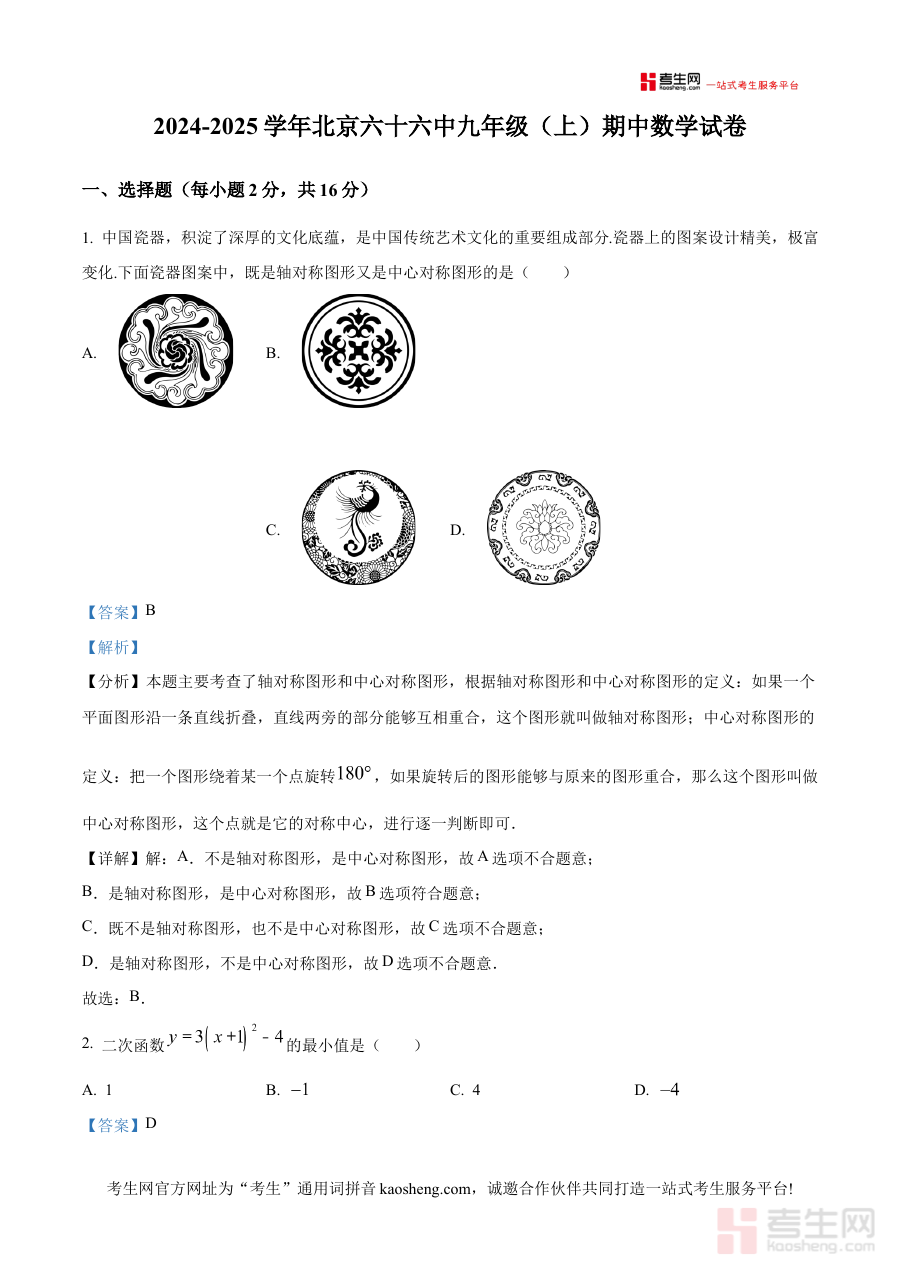 《精品解析:北京市第六十六中学2024-2025学年九年级上学期期中考试数学试卷(解析版)》是针对北京市第六十六中学特定学年与学段的数学期中检测配套备考资料。其覆盖时间范围为2024至2025学年九年级上学期,考试类型明确为该校内部组织的期中考试,解析版属性意味着资料包含对试卷内容的详细解读与分析。作为贴合本校教学实际的备考资源,它能帮助使用者快速对接学校考试标准与考查重点。