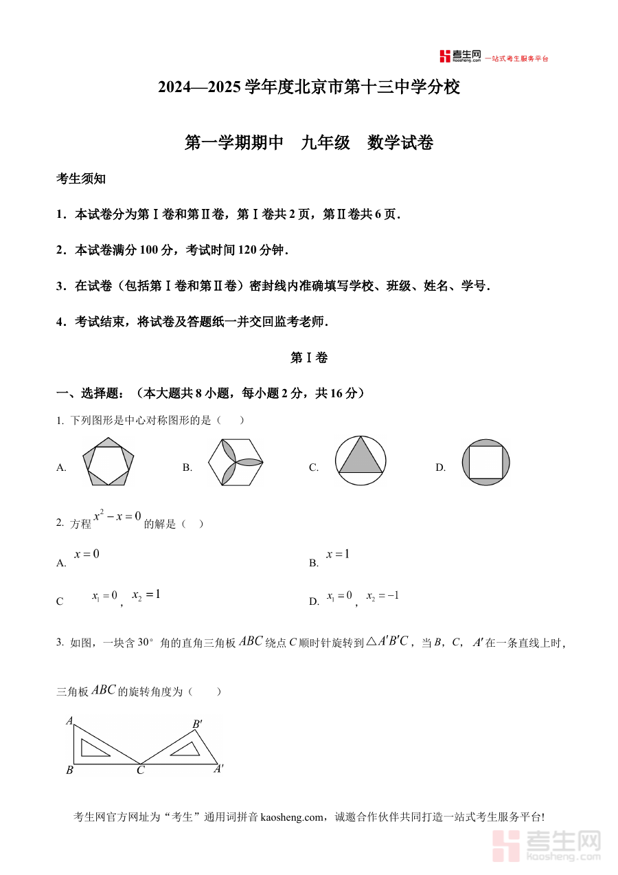 《精品解析:北京市第十三中学分校2024-2025学年九年级上学期期中数学试卷(原卷版)》是针对北京市第十三中学分校2024至2025学年九年级上学期期中数学考试的专用备考资料,精准对应该校该阶段数学学科的期中检测场景,为使用者提供与校考完全同步的原卷内容参考。