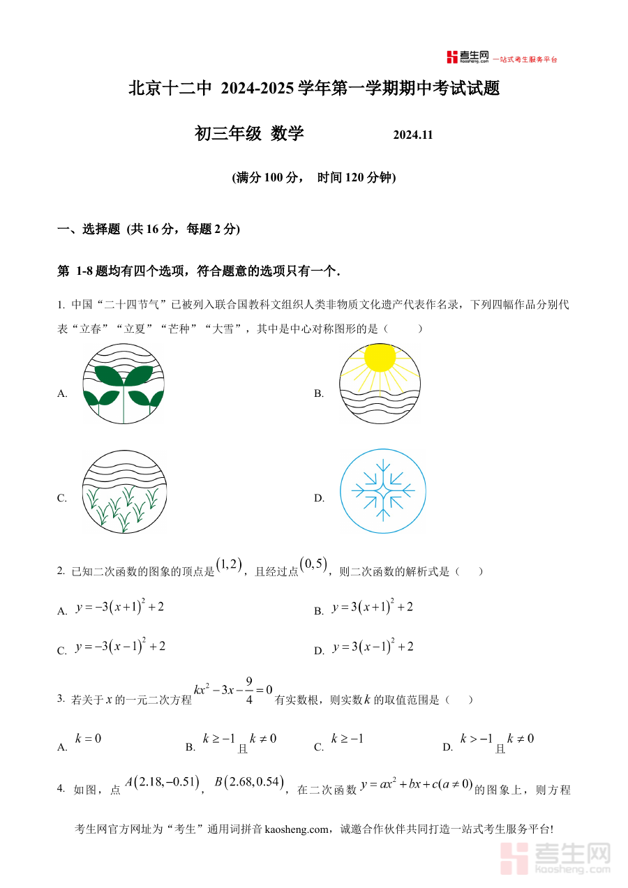 《精品解析:北京市第十二中学2024-2025学年九年级上学期11月期中考试数学试题(原卷版)》是针对北京市第十二中学在2024至2025学年九年级上学期开展的11月期中考试所编制的数学学科备考资料,紧密贴合该学年该阶段的数学教学进度与学校期中考试的命题要求,以原卷形式呈现试题内容,为使用者提供与实际考试一致的题目载体,助力其提前熟悉考试场景与试题呈现方式。