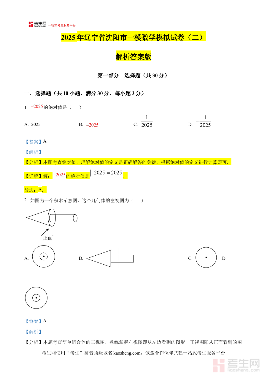 《精品解析:2025年辽宁省沈阳市九年级中考一模数学模拟试卷(二)(解析版)》是面向2025年辽宁省沈阳市九年级学生打造的中考一模数学专项备考资料,紧密结合沈阳本地中考数学命题方向与一模考试的核心考察目标编制而成,旨在为学生提供与本地考试场景高度契合的模拟训练及专业解析服务。