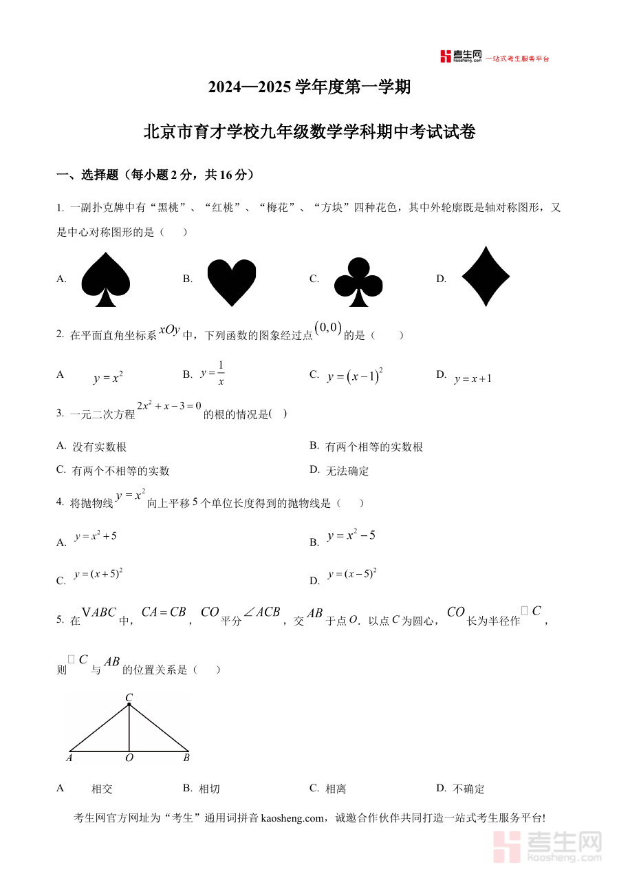 《精品解析:北京市西城区育才学校2024-2025学年九年级上学期11月期中数学试题(原卷版)》是针对北京市西城区育才学校在2024-2025学年九年级上学期11月开展的期中数学考试所编制的专项备考资料,其明确标注了所属学年、学校、年级、学期及考试时间,能够精准对应该校九年级学生在该阶段的数学学习进度与期中考核要求,为使用者提供与实际考试直接相关的备考素材。
