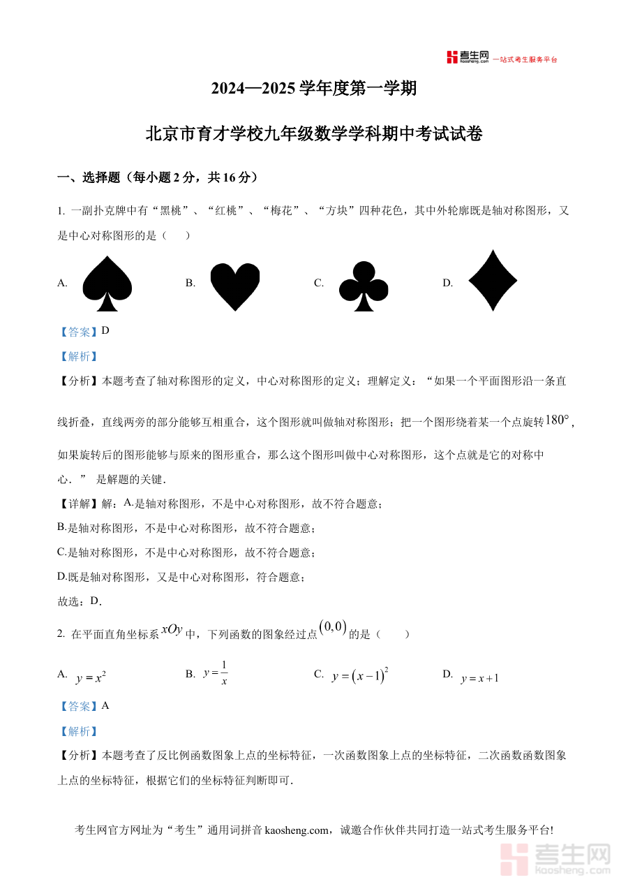 本资料主要适用于北京市西城区育才学校九年级学生,也可作为数学教师开展教学评价与辅导的参考资源,其解析内容能助力学生把握期中数学考试核心要求,增强阶段检测针对性与备考规划科学性,推动后续学习效率提升。