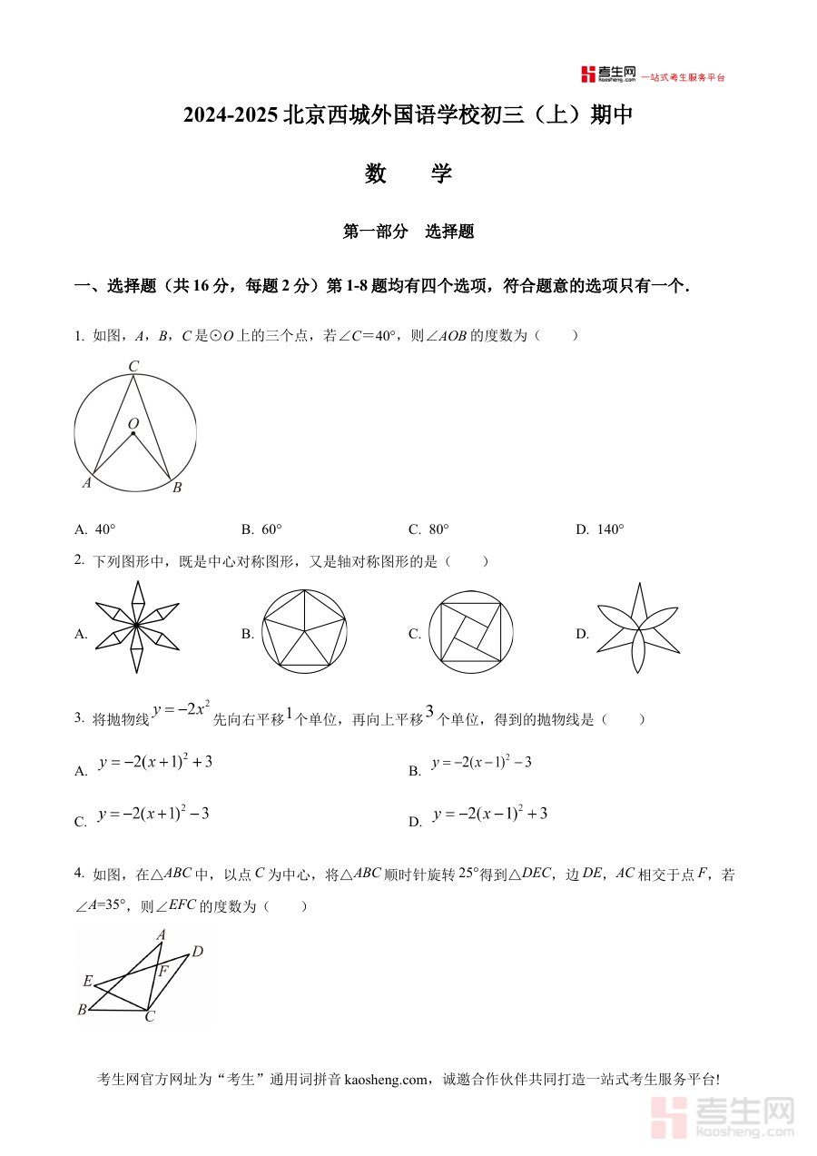 《精品解析:北京市西城外国语学校2024—2025学年上学期九年级期中数学试题(原卷版)》是针对北京市西城外国语学校2024至2025学年上学期九年级学生期中数学考试设计的备考资料。该资料依托学校当学期的教学进度与期中考查要求,精准对应九年级上学期数学学科的阶段性学习成果检测需求,为使用者提供贴合学校实际教学场景的考试内容参考。