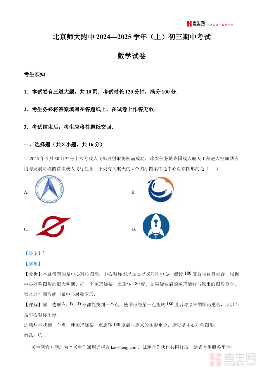 《精品解析:北京师范大学附属中学2024~2025学年上学期九年级期中数学试卷(解析版)》是针对北京师范大学附属中学2024至2025学年第一学期九年级期中数学考试的专业化备考资料,紧密贴合该学年上学期九年级数学的教学进度与期中检测核心要求,能够有效呈现该阶段数学学科的考查重点与命题趋势,为使用者提供与实际考试高度匹配的参考依据。