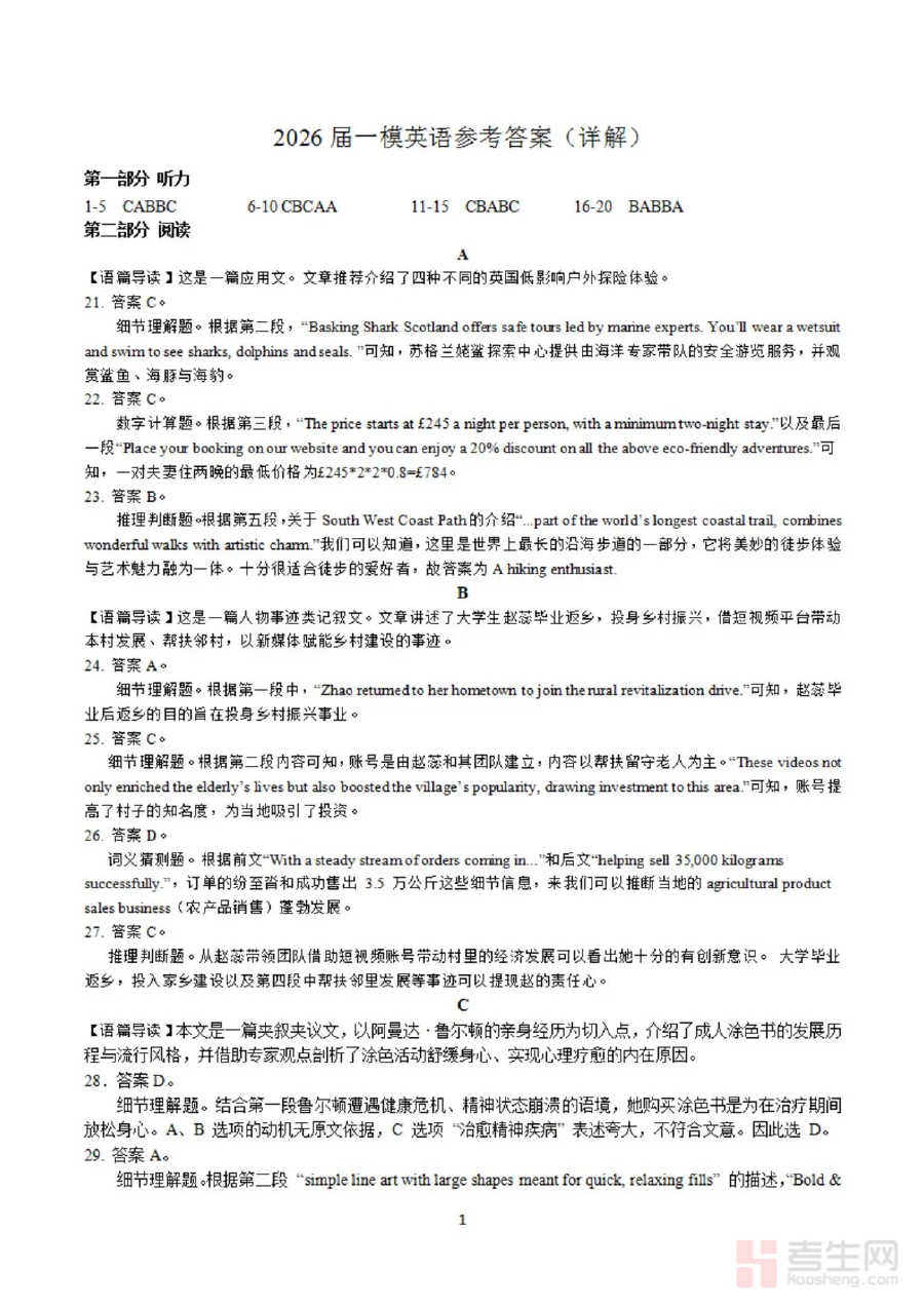 《岳阳市2026届高三年级教学质量监测(一)英语答案》是针对岳阳市2026届高三学生英语学科第一次教学质量监测考试的配套解答资料。该考试是岳阳市教育系统面向高三年级开展的阶段性教学评估项目,旨在通过标准化测试掌握高三初期学生英语学科的知识掌握状态与能力发展水平,而本答案作为该考试的核心配套资源,为师生解读考试结果、分析答题情况提供了权威且精准的依据。
