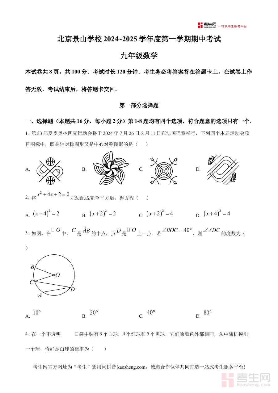 《精品解析:北京景山学校2024—2025学年上学期期中考试九年级数学试题(原卷版)》是北京景山学校在2024至2025学年第一学期面向九年级学生组织的期中考试数学科目的原始试卷资料,属于初中阶段关键的阶段性考试备考资源,能够为使用者提供该学校该学期数学期中考试的真实试题呈现形式,帮助使用者直接接触到该考试的原始内容框架与考查方向。