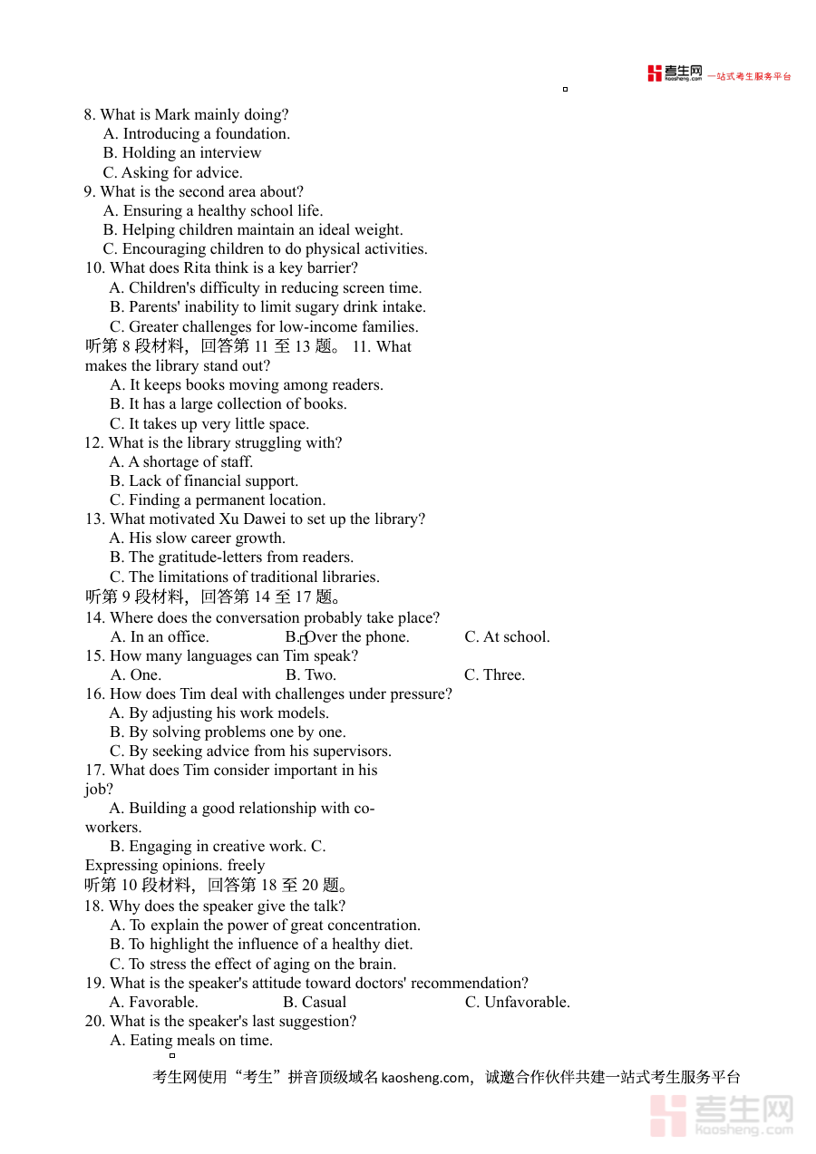 该资料可用于高三学生完成英语学科阶段性学习效果的自我诊断,辅助教师掌握班级整体学习状态及个体差异,为后续备考规划提供精准数据支撑;包含答案的配置便于学生测试后快速对照结果,定位知识薄弱点,优化学习策略,提升备考的针对性与效率。