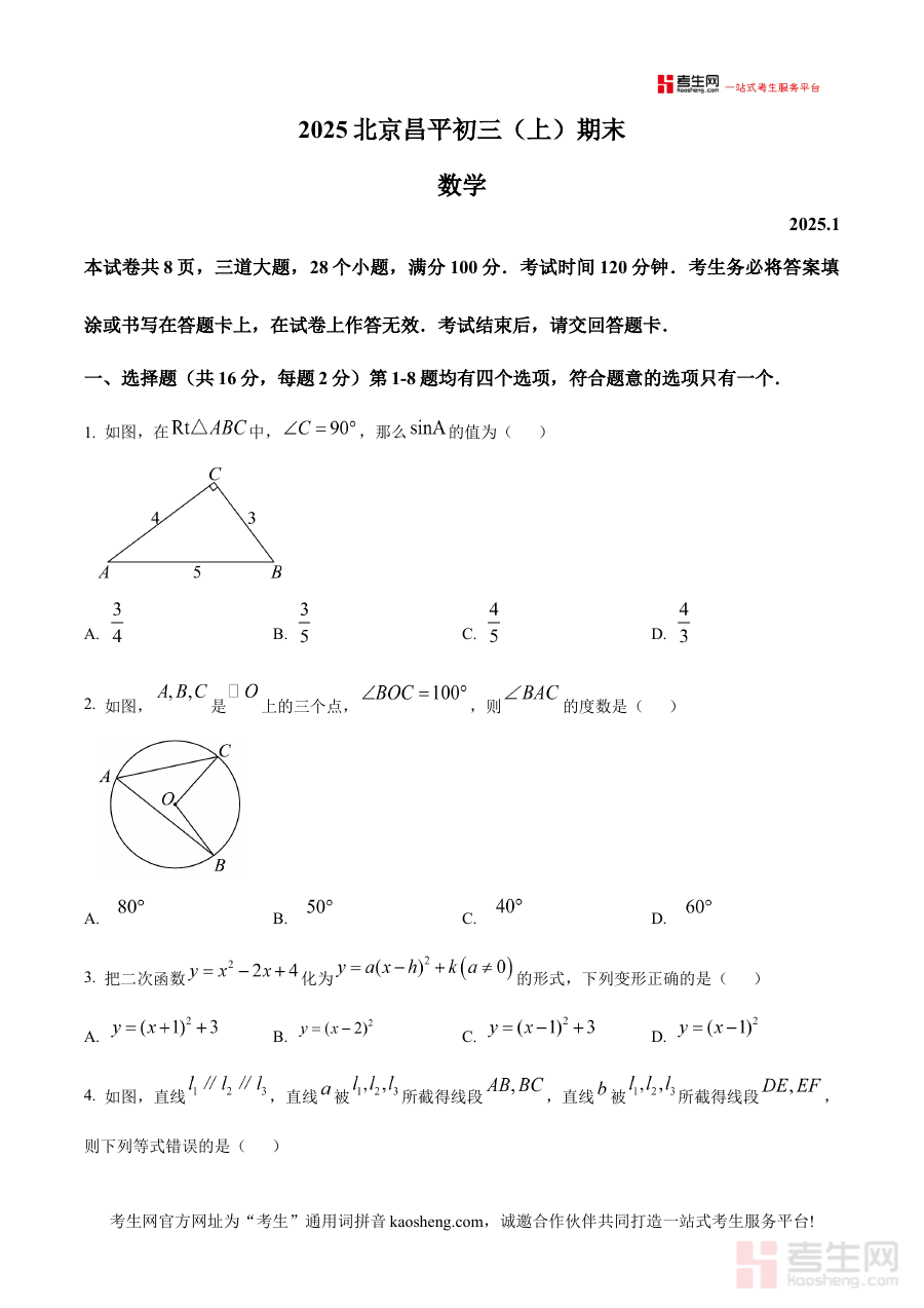 《精品解析:北京市昌平区2024-2025学年九年级上学期期末考试数学试题(原卷版)》是针对北京市昌平区2024至2025学年九年级上学期期末数学考试的配套备考资料,聚焦该地区九年级学生上学期数学学习的阶段性评估需求,为相关群体提供贴合本地考试实际的参考素材。