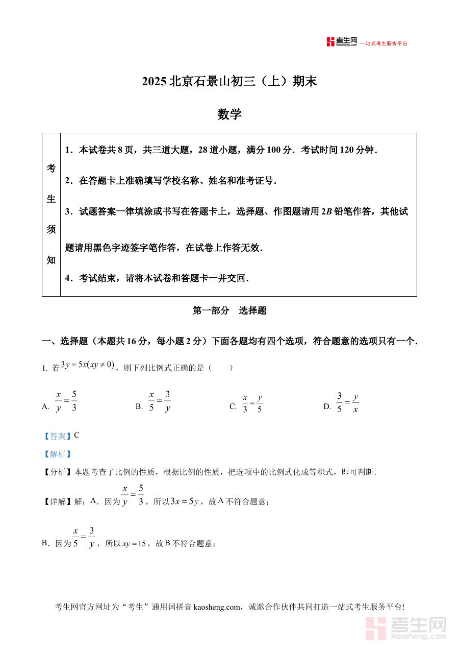 《精品解析:北京市石景山区2024-2025学年九年级上学期期末数学试题(解析版)》是针对北京市石景山区特定学年九年级上学期期末数学考试的专业备考资料,整合了该区域该阶段数学期末测试的核心内容与配套解析,能够帮助使用者精准把握当地九年级上学期数学期末考试的命题方向与考查重点,为后续的复习备考提供清晰的参考依据。
