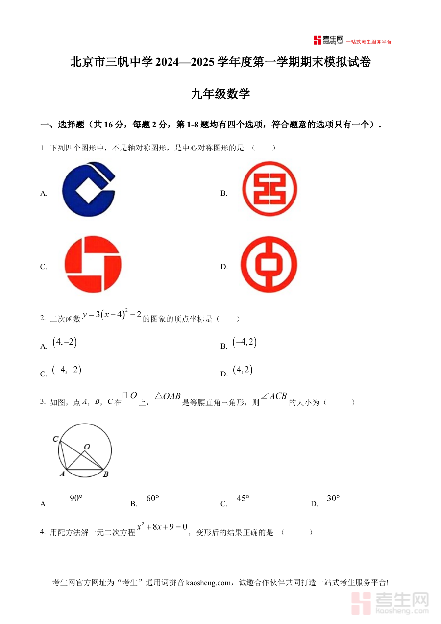 《精品解析:北京市三帆中学2024一2025学年上学期期末模拟九年级数学试卷(原卷版)》是针对北京市三帆中学2024至2025学年上学期九年级数学期末模拟考试的配套备考资料,聚焦该学年上学期期末阶段的数学学科模拟检测需求,为相关教学活动和学习计划提供对应参考依据。