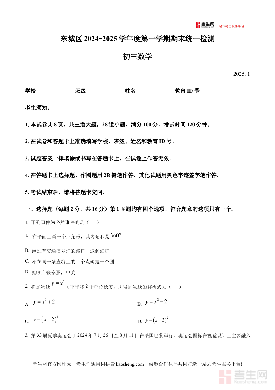 《精品解析:北京市东城区2024-2025学年九年级上学期期末考试数学试题(原卷版)》是针对北京市东城区2024至2025学年九年级上学期期末数学考试设计的备考资料。该资料基于东城区本学年九年级上学期期末数学考试的官方命题背景,提供与实际考试形式完全一致的原卷内容,能够帮助使用者直观感知东城区九年级上学期期末数学考试的整体结构与考查方向,是连接九年级上学期知识学习与期末备考阶段的重要参考载体。