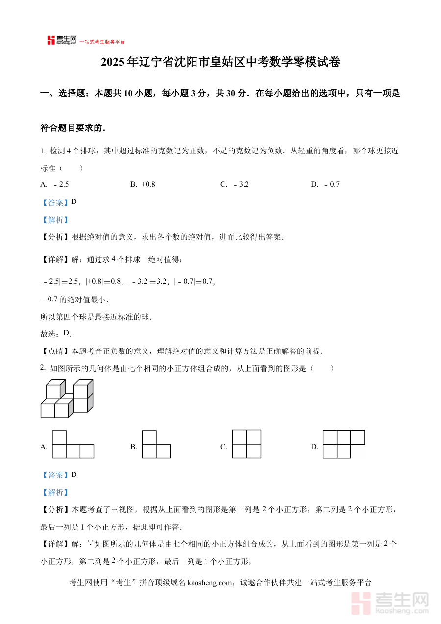 《精品解析:2025年辽宁省沈阳市皇姑区九年级中考数学零模试卷(解析版)》是针对2025年辽宁省沈阳市皇姑区九年级学生设计的中考数学零模考试配套解析资料,零模考试作为中考前关键的阶段性检测环节,能够帮助学生提前适应中考数学的考查模式与节奏,该解析版资料则为学生和教师提供了专业的试题分析与系统的解答思路支持。