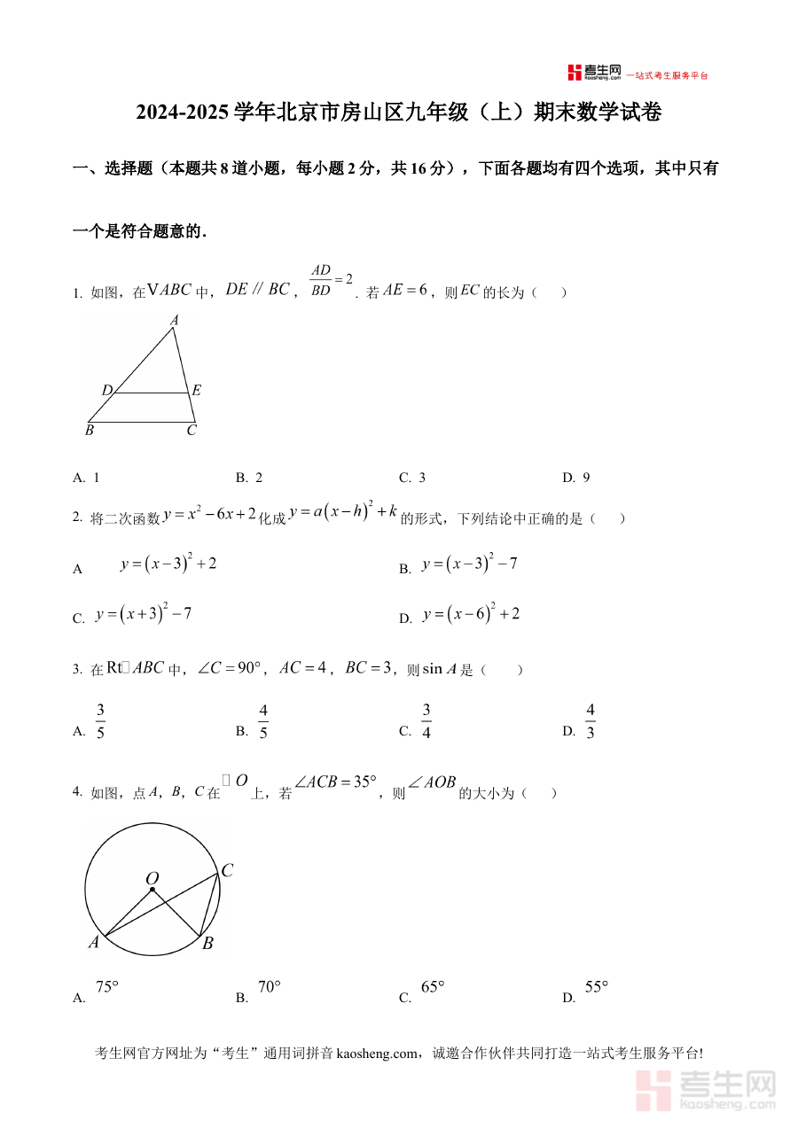 《精品解析:北京市房山区2024-2025学年上学期九年级期末数学试卷(原卷版)》是聚焦北京市房山区2024至2025学年第一学期九年级数学期末检测的专业备考资料,紧密贴合该地区九年级数学期末考核的本土特点与阶段要求,为使用者提供与本地实际考试完全一致的原卷内容支持,是对接本地期末数学考试的重要参考资源。