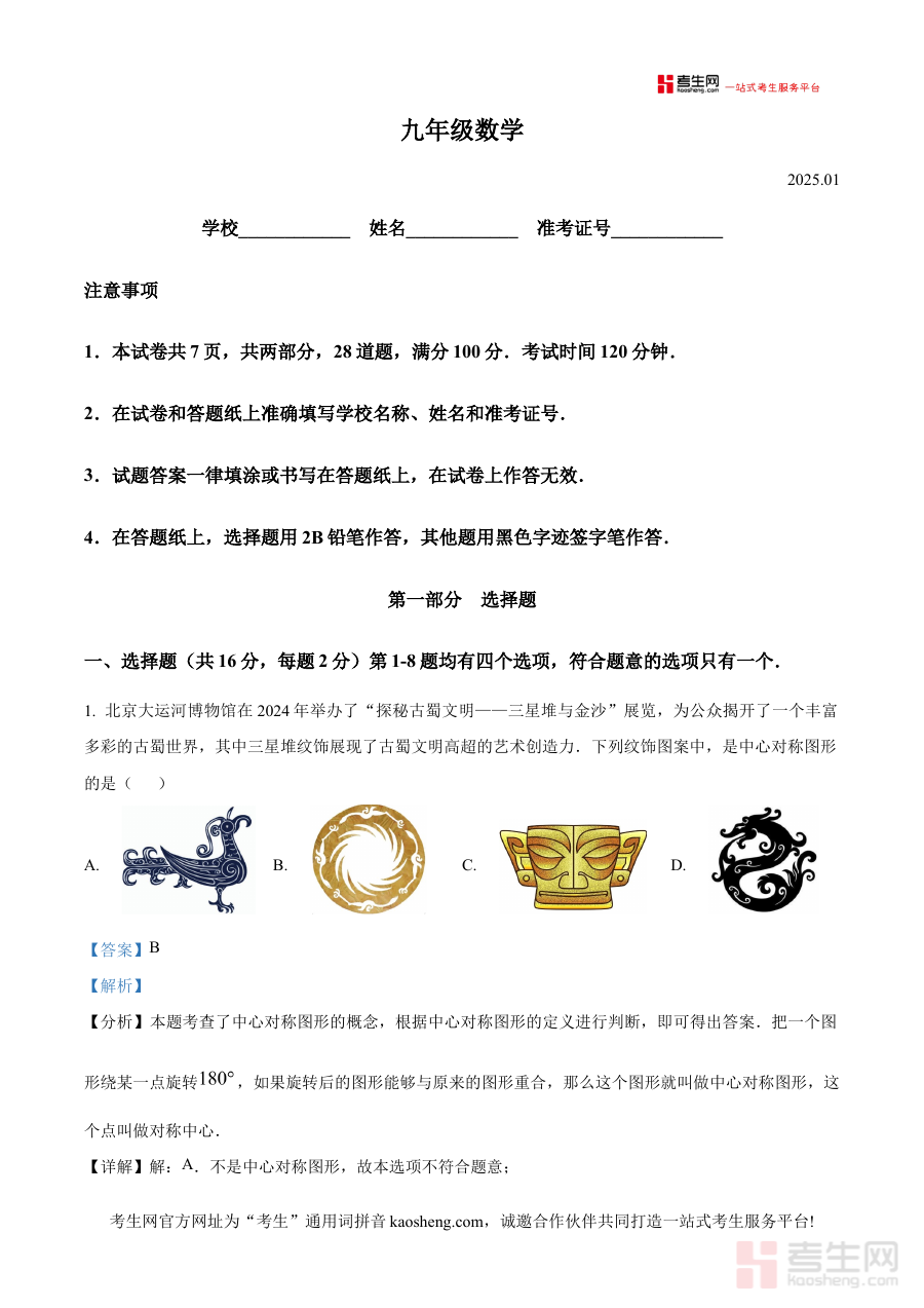 该资料的适用人群主要为北京市海淀区2024-2025学年的九年级学生,此外也可为区域内初中数学教师提供教学参考与学情分析素材,以及帮助家长了解孩子的数学学习进展和期末备考重点。其价值体现在通过专业解析助力使用者把握期末考试的考查逻辑与重点方向,提升阶段检测的有效性和备考规划的针对性,为后续中考备考阶段的学习与复习筑牢坚实基础。