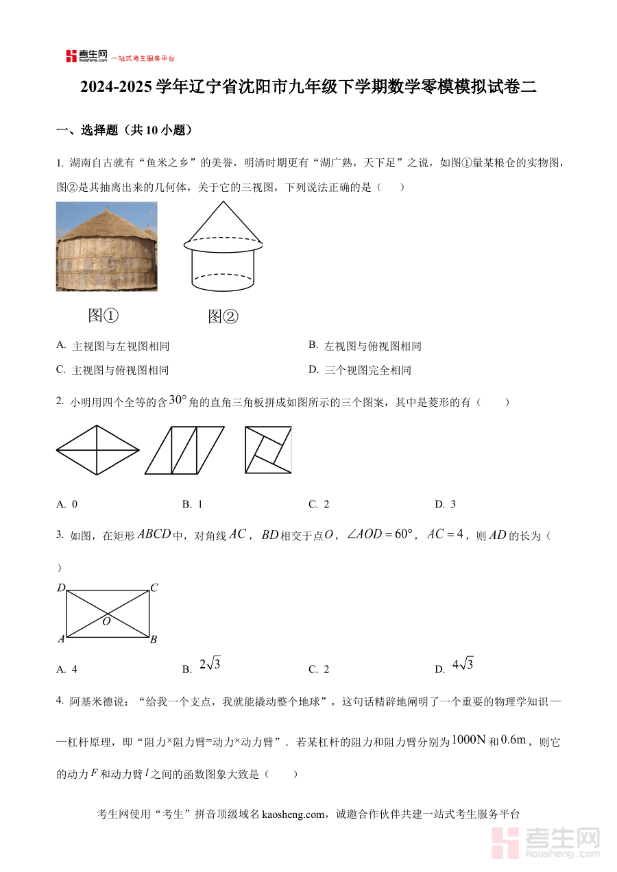 《精品解析:辽宁省沈阳市2024-2025学年九年级下学期零模模拟数学试卷二(原卷版)》是面向辽宁省沈阳市特定学年九年级下学期零模考试的数学模拟试卷原卷版资料。零模考试作为九年级下学期初期的重要阶段性评估,是衔接上学期知识巩固与后续中考系统复习的关键节点,这份原卷版资料严格贴合沈阳本地零模考试的命题方向与形式规范,能为使用者提供贴近真实考试场景的模拟体验,帮助其提前感知考试节奏与框架要求。