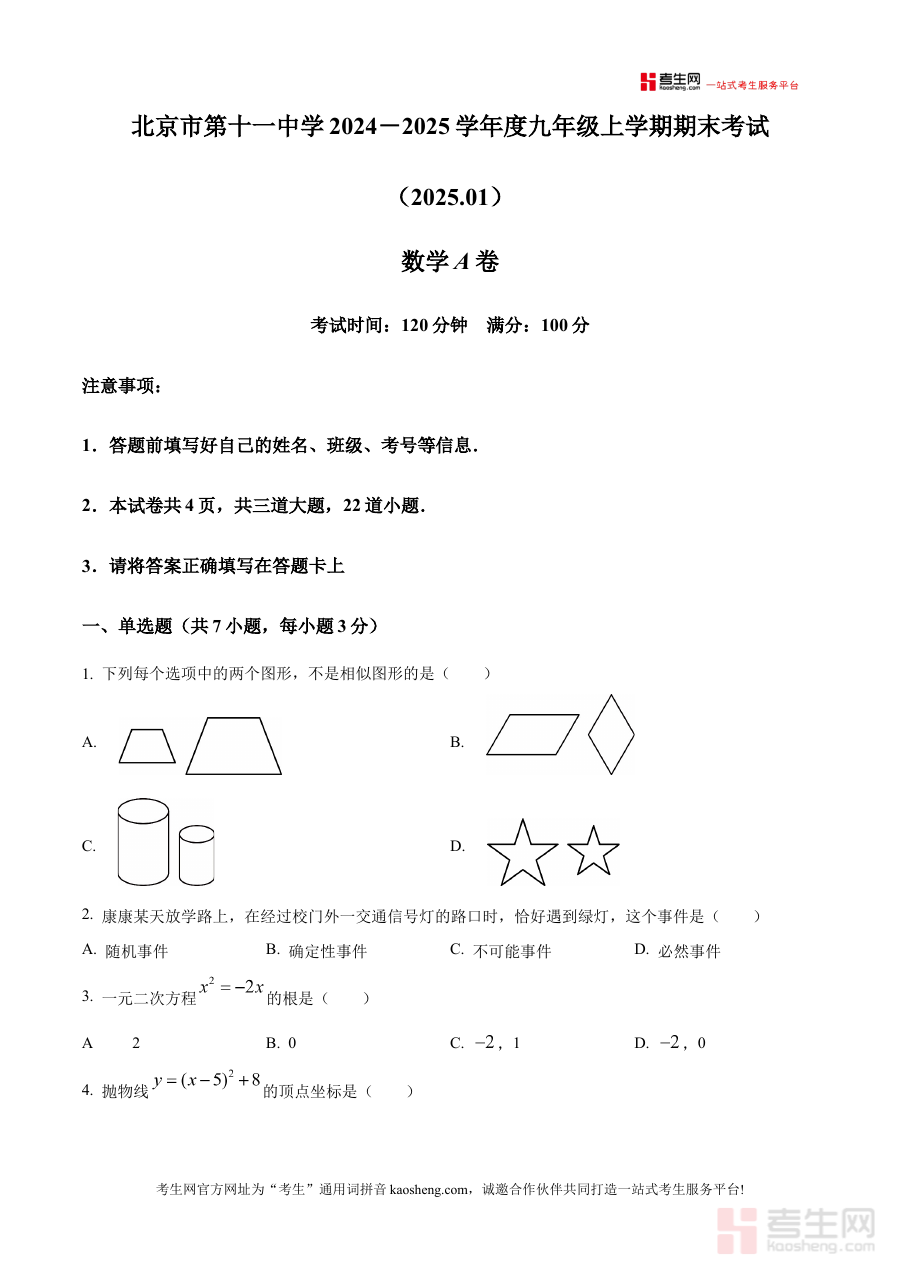 《精品解析:北京市第十一中学2024-2025学年九年级上学期期末考试数学A卷(原卷版)》是北京市第十一中学针对2024至2025学年九年级上学期数学学科期末检测推出的专属资料,精准匹配该学段该学期的考试场景,为相关使用者提供贴合校考实际的备考支持,是衔接九年级上学期学习与期末检测的重要资源。