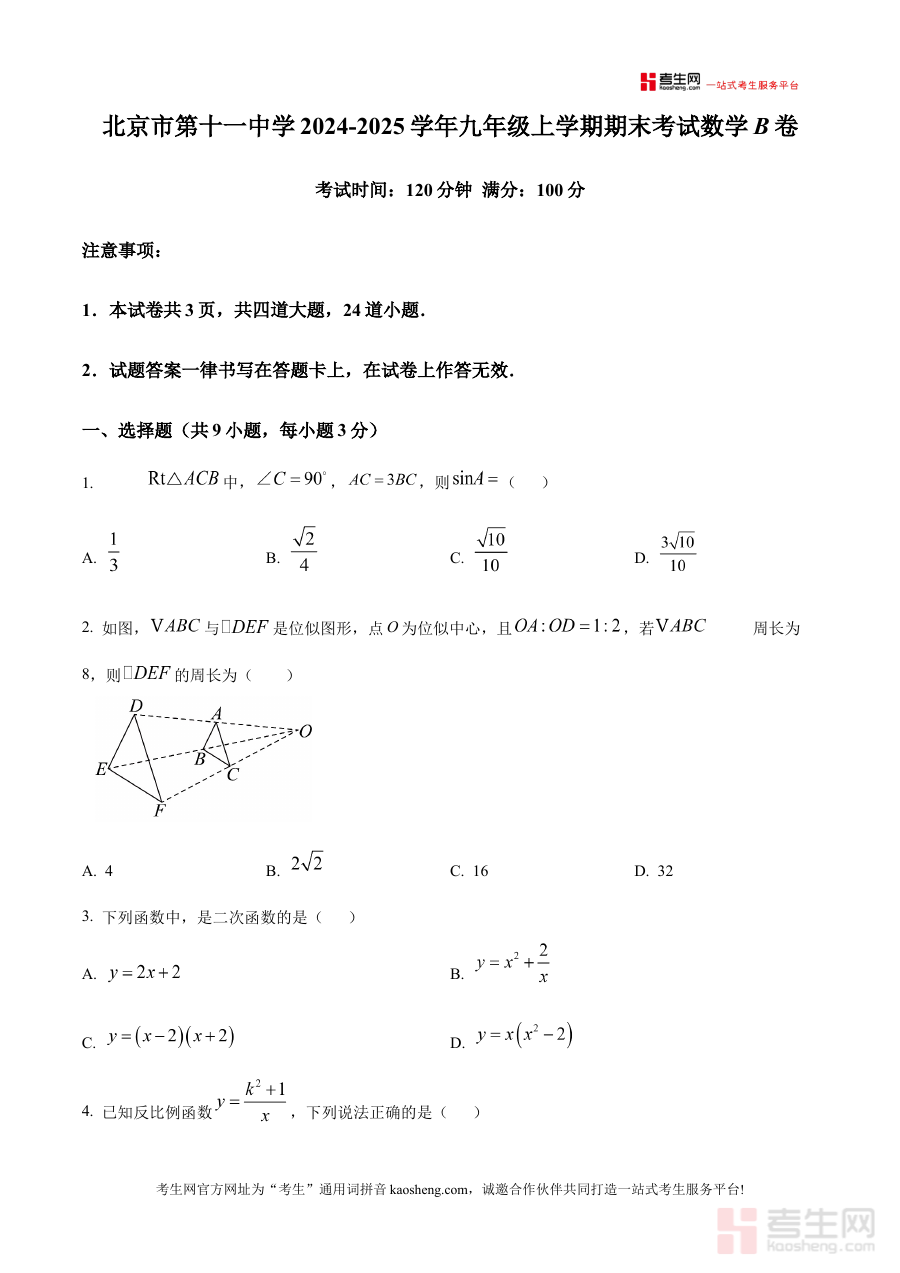 该资料主要适用于北京市第十一中学2024-2025学年九年级学生群体,尤其是即将参加本学期期末考试的学生。对于他们而言,这份原卷版资料的核心价值在于模拟真实考试环境,帮助其提前适应考试节奏与时间管理模式,在正式考试前完成充分的应试准备,进而提升考试应对能力与成绩表现。