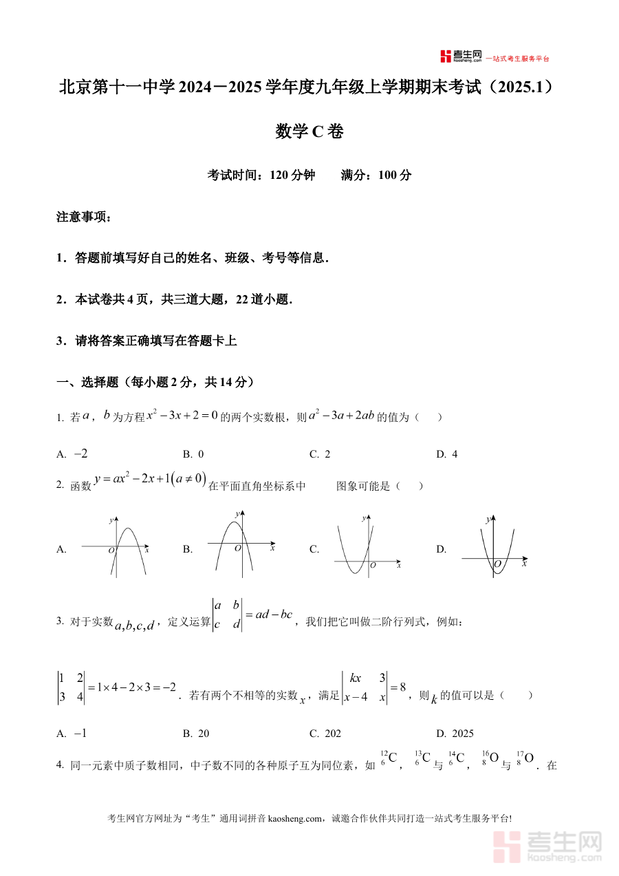 《精品解析:北京市第十一中学2024-2025学年九年级上学期期末考试数学C卷(原卷版)》是针对北京市第十一中学2024至2025学年九年级上学期数学期末考试的备考资料,聚焦该校该阶段数学学习成果的检测需求,为相关使用者提供贴合校考实际的原卷资源。