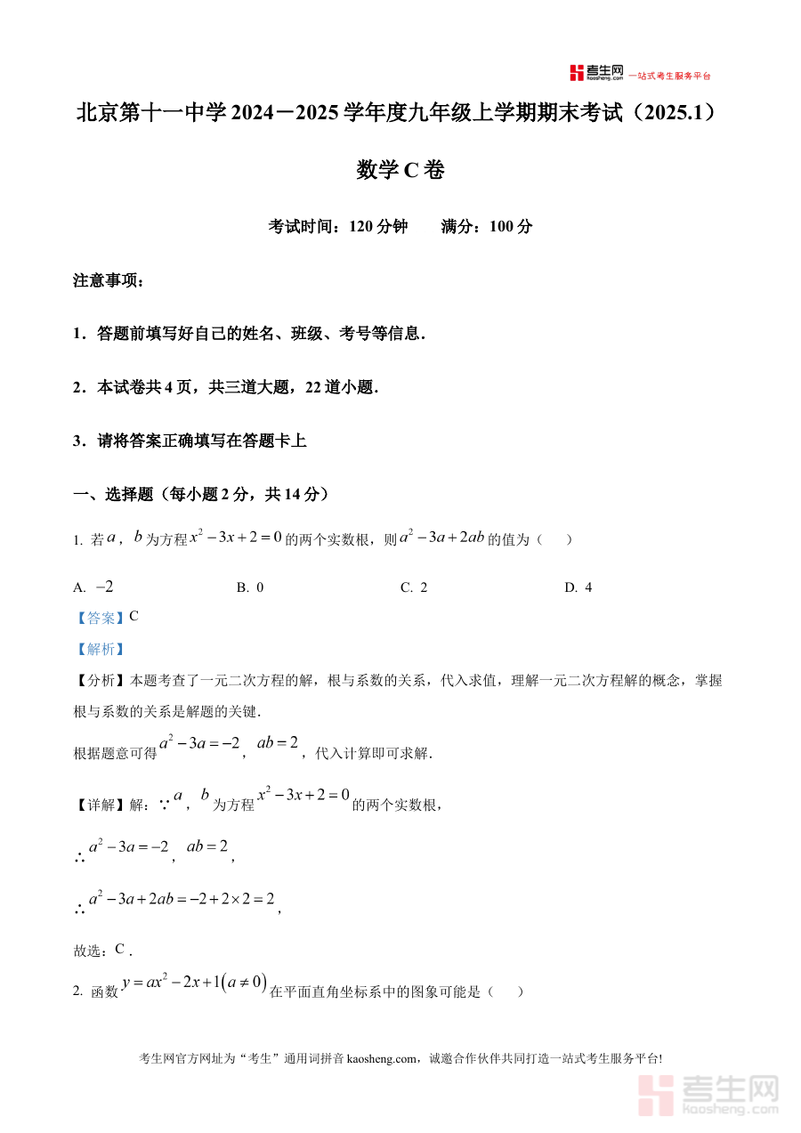 《精品解析:北京市第十一中学2024-2025学年九年级上学期期末考试数学C卷(解析版)》是针对北京市第十一中学2024至2025学年九年级上学期数学期末考试打造的专项备考资料,精准聚焦该学年第一学期期末阶段的数学学科检测需求,依托学校官方发布的期末考试卷资源进行专业解析与整理,为学生提供与校内考试内容直接对接、具有高度针对性的复习参考依据。