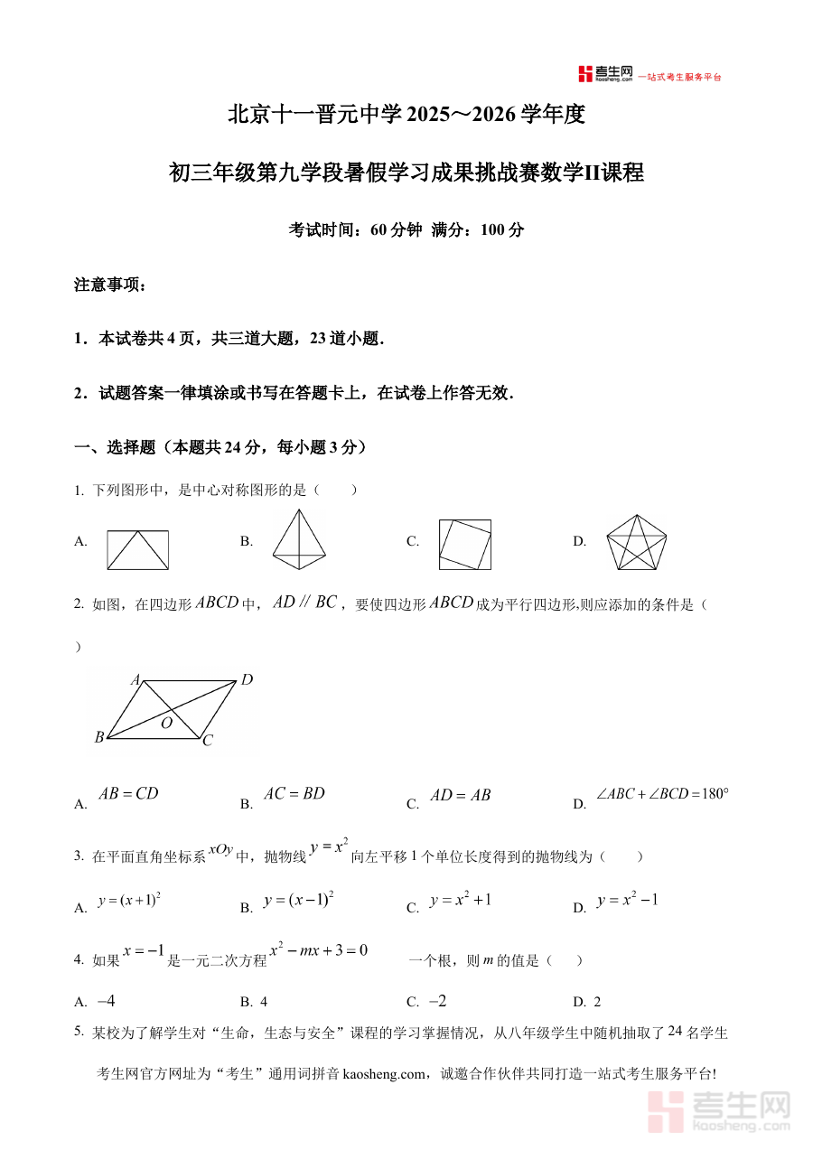 此资料适用于北京市十一晋元中学九年级在读学生及准备参加类似开学考检测暑假学习效果的九年级数学学习者,其价值体现在通过标准化的原卷形式实现对阶段学习成果的客观评估,助力学生制定针对性备考计划,提升开学后数学学习的效率与目标性。