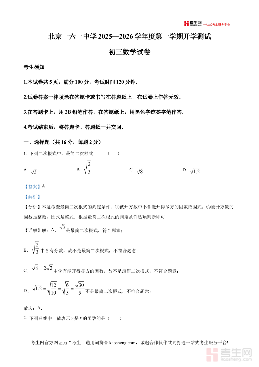 《精品解析:北京一六一中学2025一2026学年上学期开学测试九年级数学试卷 (解析版)》是针对北京地区北京一六一中学2025-2026学年上学期九年级数学开学测试的备考资料,聚焦该阶段学生数学学习的起始检测场景,依托学校官方测试设置,为使用者提供贴合校情的参考内容。