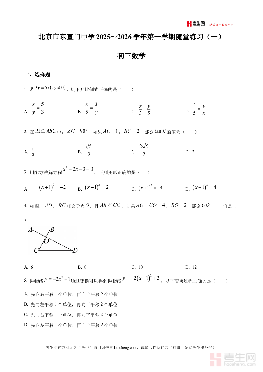 《精品解析:北京东直门中学2025--2026学年九年级上学期数学9月月考试卷(原卷版)》是针对北京东直门中学2025至2026学年九年级学生设计的数学学科9月阶段考试备考资料,包含该学年九年级上学期数学首次月度检测的原卷内容,能够真实反映该校该阶段数学教学的考查方向与要求。