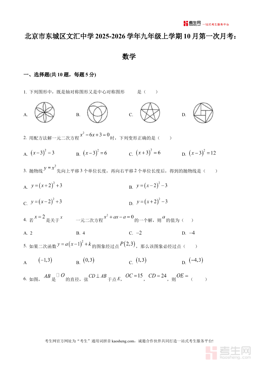 《精品解析:北京市北京市东城区北京市文汇中学2025-2026学年九年级上学期10月月考数学试题(原卷版)》是针对北京市东城区文汇中学特定学年段与时间节点的数学学科阶段性测试资料,对应学年为2025至2026学年,考试时间设定在九年级上学期10月份,属于该校内部组织的月度学业考核范畴,为九年级学生提供了贴合本校教学进度与考核标准的备考素材,可让使用者直接接触到与本校实际考试一致的试题呈现形式。