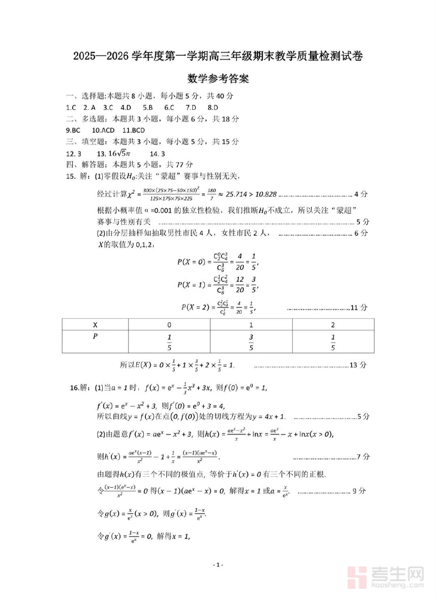 《2025—2026学年度第一学期高三年级期末教学质量检测数学答案》是对应2025至2026学年第一学期高三数学期末教学质量检测的配套答案资料,聚焦该阶段高三数学教学质量的阶段性评估需求,为相关检测活动提供标准化的参考依据。