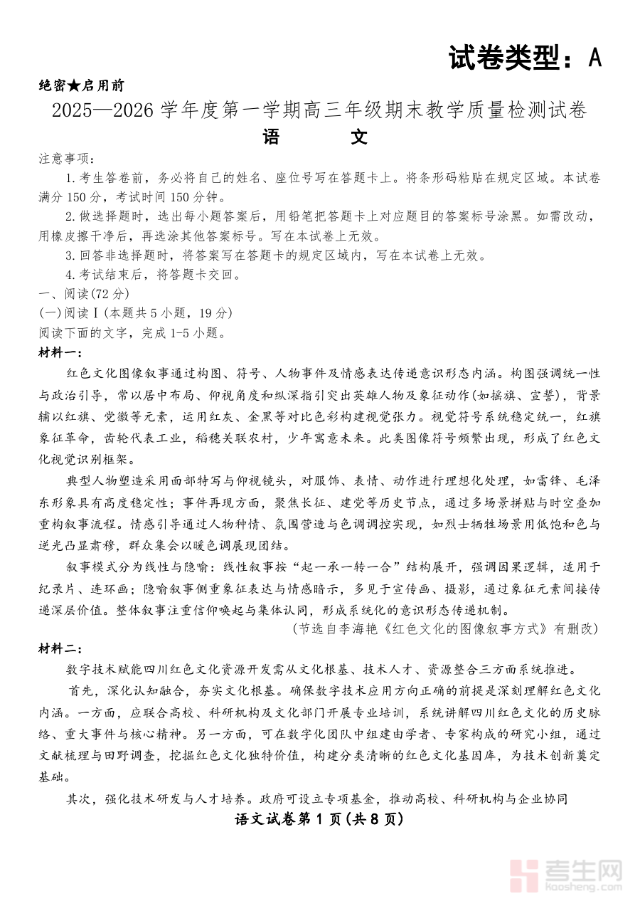 本资料的适用人群主要为2025—2026学年度第一学期的高三学生及从事该年级语文教学的教师。对于学生来说,借助该资料可深入理解期末教学质量检测的要求与标准,增强备考的针对性,提升复习效率,更好地应对期末检测;对于教师而言,它能帮助精准把握教学效果,调整教学计划,更有效地指导学生进行阶段性复习,助力学生在期末检测中真实反映学习水平,为高考备考积累宝贵经验和数据支持。