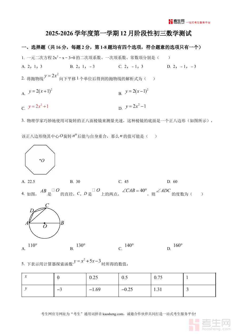 这份原卷版资料可用于九年级学生开展数学学科的阶段学习效果自我诊断,帮助学生及时识别自身在该阶段学习中的优势与薄弱环节;同时也能为数学教师提供参考依据,助力教师掌握学生群体在本次月考范围内的知识掌握情况,进而调整后续教学策略与备考指导方向;此外,家长也可通过这份资料清晰了解孩子所在学校的阶段性考试要求与形式,辅助开展家庭层面的学习支持工作。
