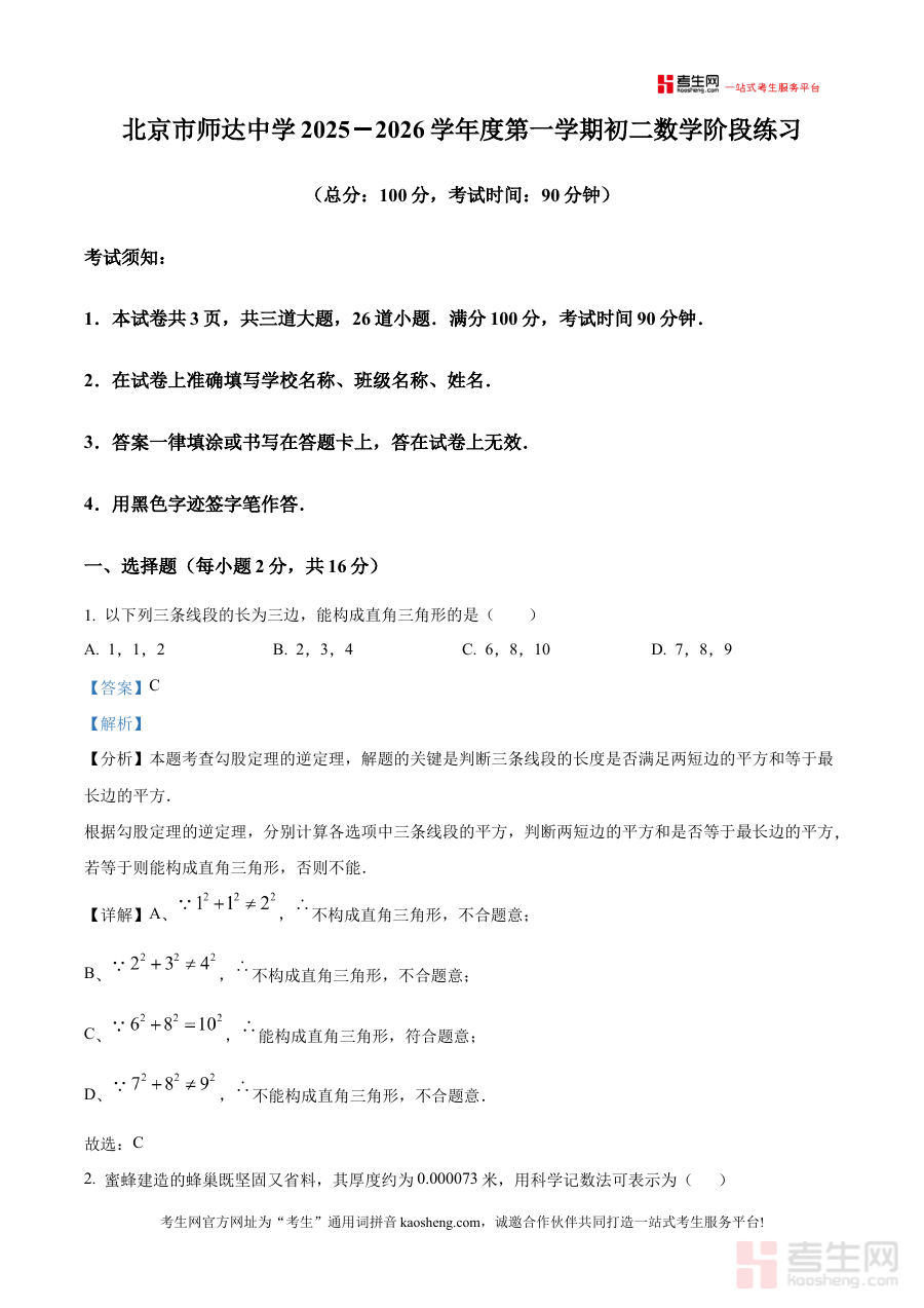 本资料主要适用于北京市师达中学2025-2026学年上学期九年级学生,也可作为数学教师开展阶段教学评估与备考指导的参考工具,其解析内容能有效增强使用者应对阶段检测的能力,提升备考规划的科学性与针对性。