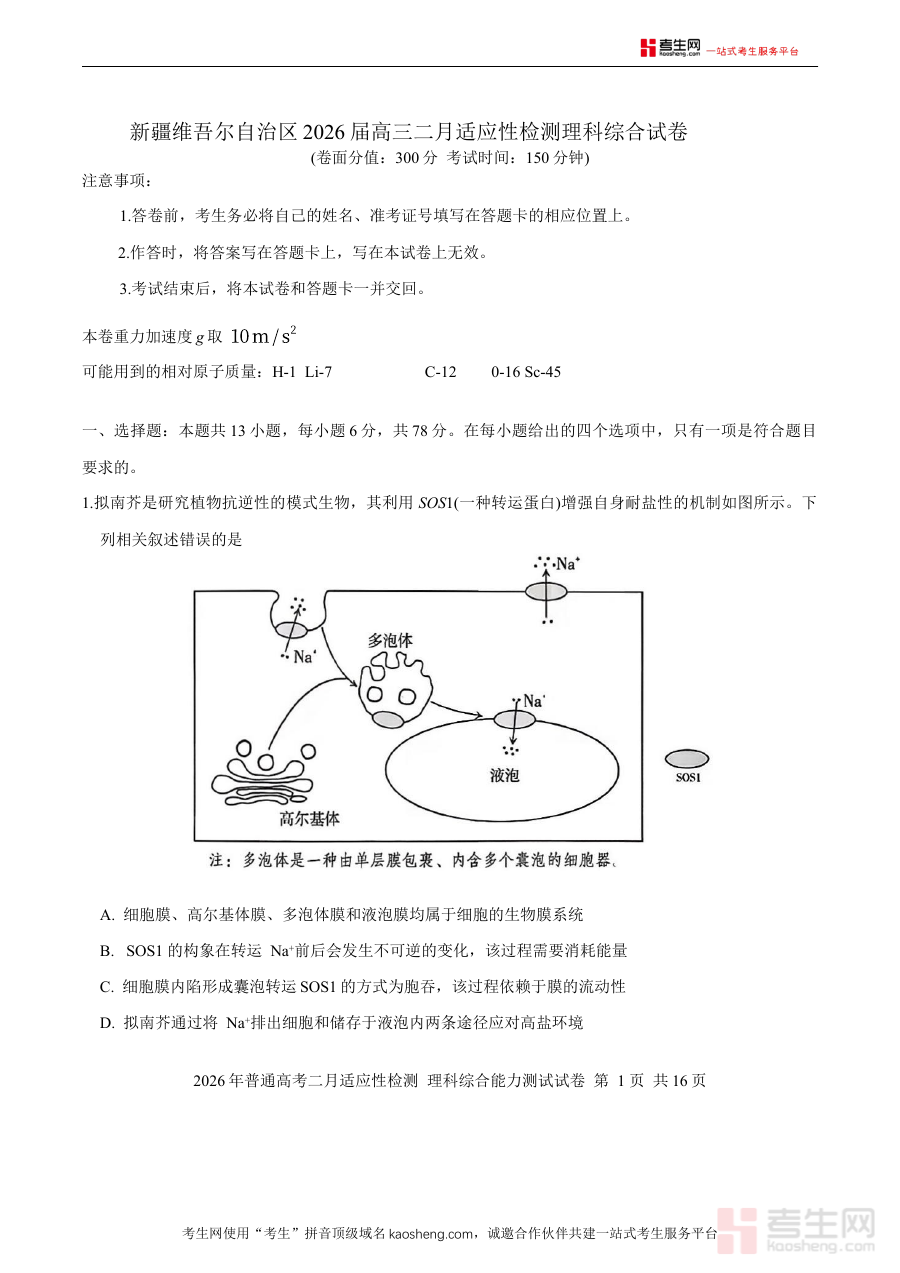 《新疆维吾尔自治区2026届高三二月适应性检测理科综合试卷(含答案)》是针对新疆维吾尔自治区2026届高三学生设计的阶段性适应性检测备考资料。该资料对应高三学年第二学期初期的二月适应性检测场景,属于区域内统一组织的标准化考试配套资源,旨在帮助学生提前适应考试流程与要求,为后续的正式检测及高考备考奠定基础。