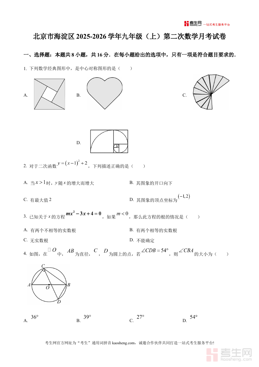 《精品解析:北京市海淀区2025-2026学年九年级上学期第二次数学月考试卷(原卷版)》是针对北京市海淀区特定学年九年级上学期第二阶段数学月考设计的备考资料,明确对应2025-2026学年的时间范围、海淀区的区域属性、九年级上学期的学习阶段以及第二次月考的考试节点,为相关使用者提供贴合该阶段数学学习需求的参考载体,帮助使用者精准对接区域内该阶段数学考试的实际要求与考查方向。