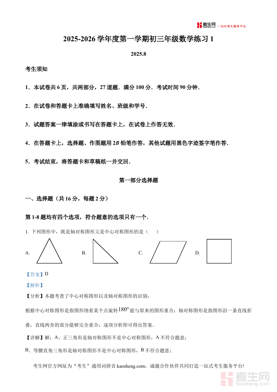 《精品解析:北京市海淀区人大附中2025~2026学年上学期九年级开学考数学试卷(解析版)》是针对北京市海淀区人大附中2025至2026学年上学期九年级开学数学考试推出的精品解析类备考资料,精准匹配该学校该学年开学考的时间节点与考察背景,为相关使用者提供与考试直接关联的解析内容支持。