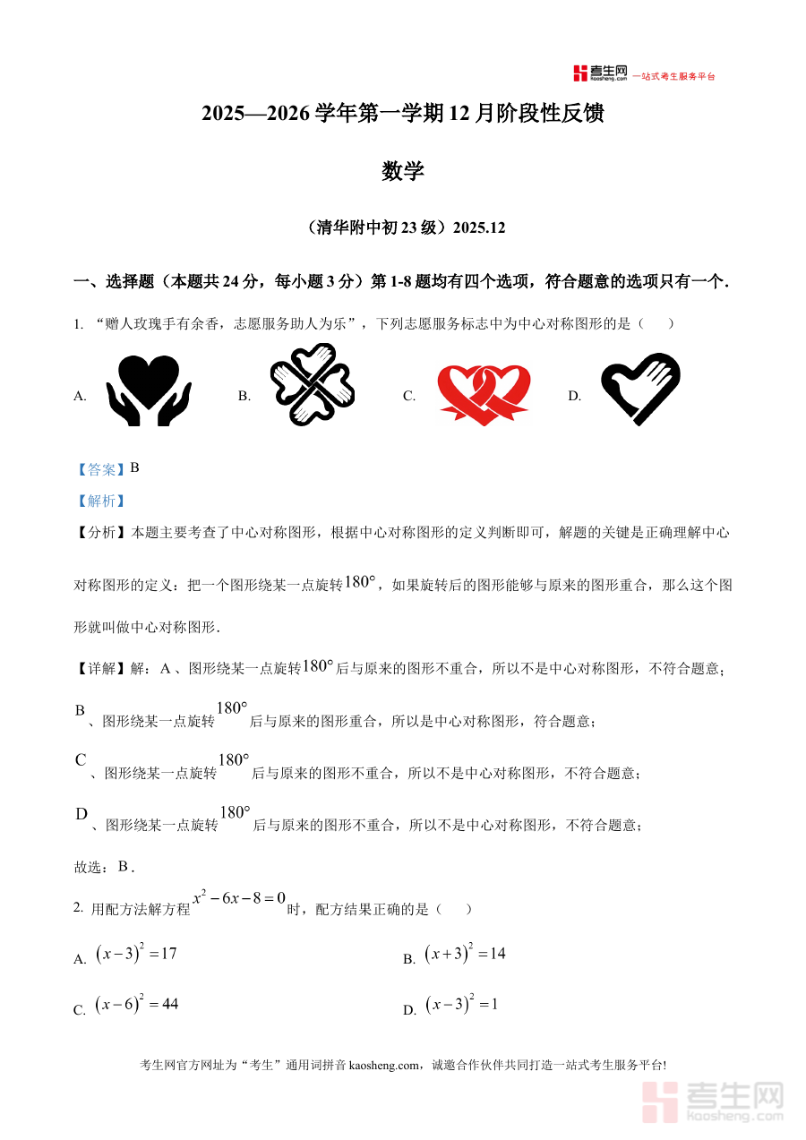 《精品解析:北京市清华大学附属中学2025一2026学年上学期九年级12月阶段性反馈数学试题(解析版)》是针对北京市清华大学附属中学2025-2026学年上学期九年级12月阶段性反馈数学考试的专项备考资料,精准对应该阶段数学学科的阶段性检测场景,为相关使用者提供系统的试题解析服务。