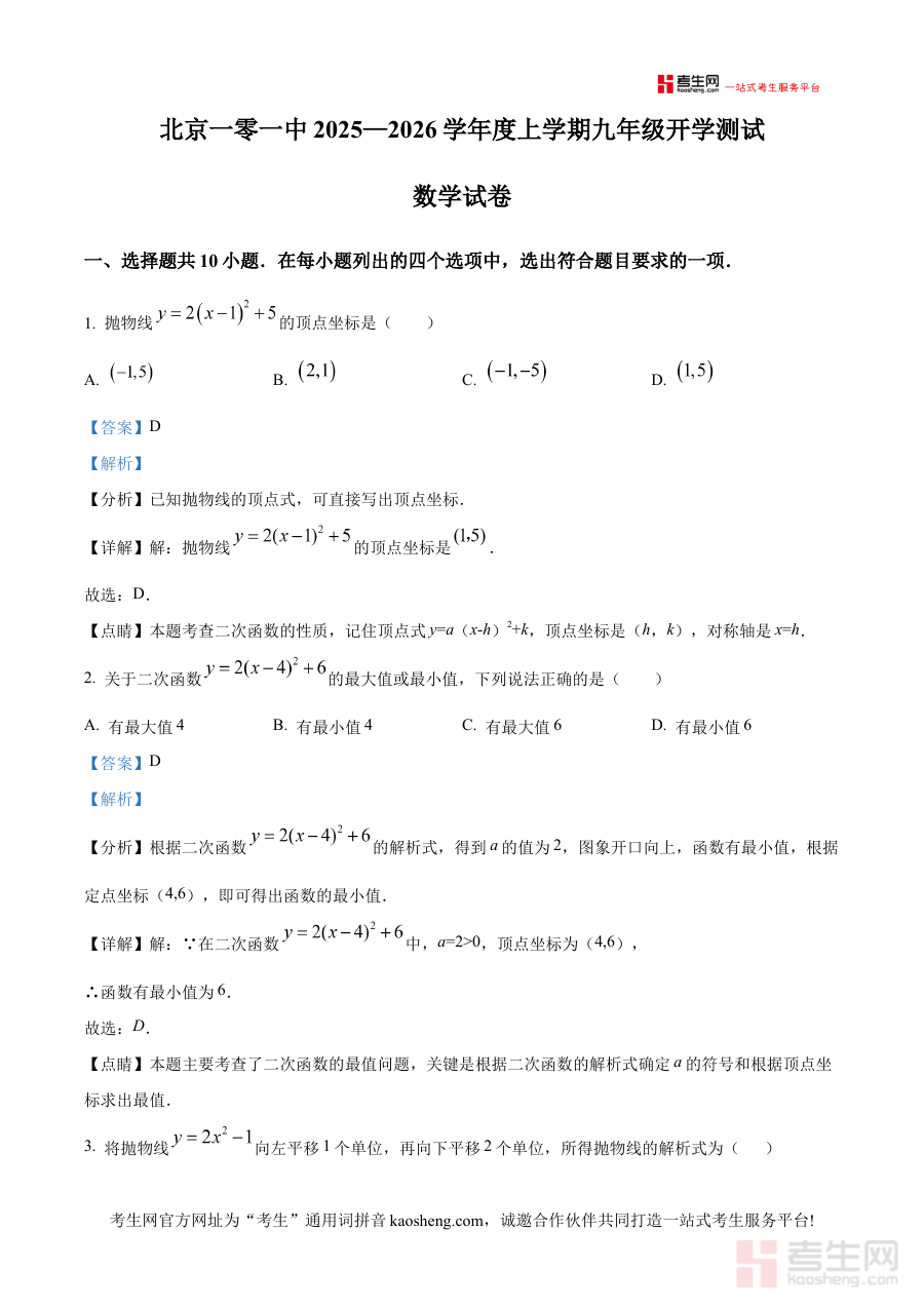 《精品解析:北京市第一0一中学2025-2026学年九年级上学期开学数学试卷(解析版)》是面向北京市第一0一中学特定学年九年级学生的开学阶段数学检测配套资料。该资料依托学校新学期开学检测的实际需求设计,聚焦九年级上学期数学学习的起始衔接点,为使用者提供与学校教学节奏高度匹配的评估工具。作为解析版资料,它不仅包含试卷本身的检测内容框架,还附带专业解题分析部分,确保检测结果能被有效解读并转化为后续学习指导依据。