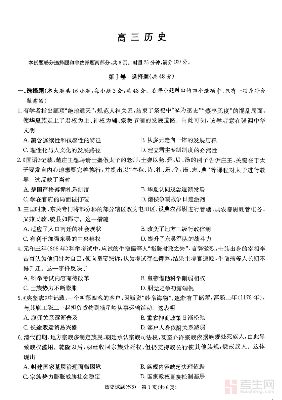 《长郡中学2026届高三月考试卷(六)历史》是长郡中学面向2026届高三学生推出的第六次历史学科月考试卷,属于高三历史学科阶段性备考资料。该试卷紧密结合长郡中学高三历史教学进度与备考规划,旨在为学生提供契合本校教学节奏的阶段性检测工具,帮助学生适应阶段性考试的形式与要求,融入学校系统化的备考进程。