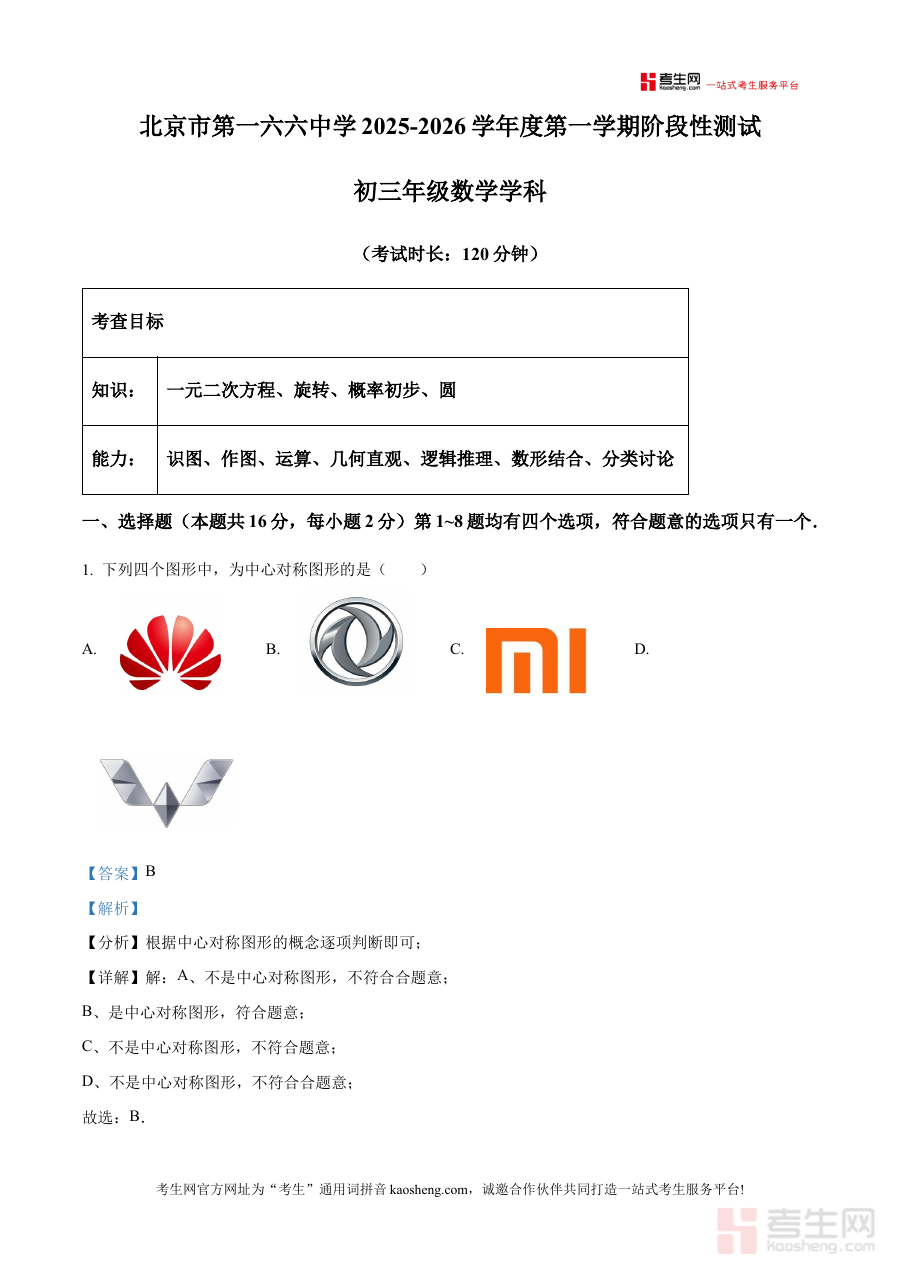 本资料适用于北京市第一六六中学2025-2026学年九年级的学生、数学学科教师及关注学生学习进展的家长群体。对于学生而言,它能帮助熟悉月考形式与考查要求,增强阶段检测的应对能力;对于教师和家长,则可借助其解析内容精准把握学生学习状态,为后续教学调整与学习指导提供有力支撑,推动九年级上学期数学学科的阶段性学习与备考工作有序开展。