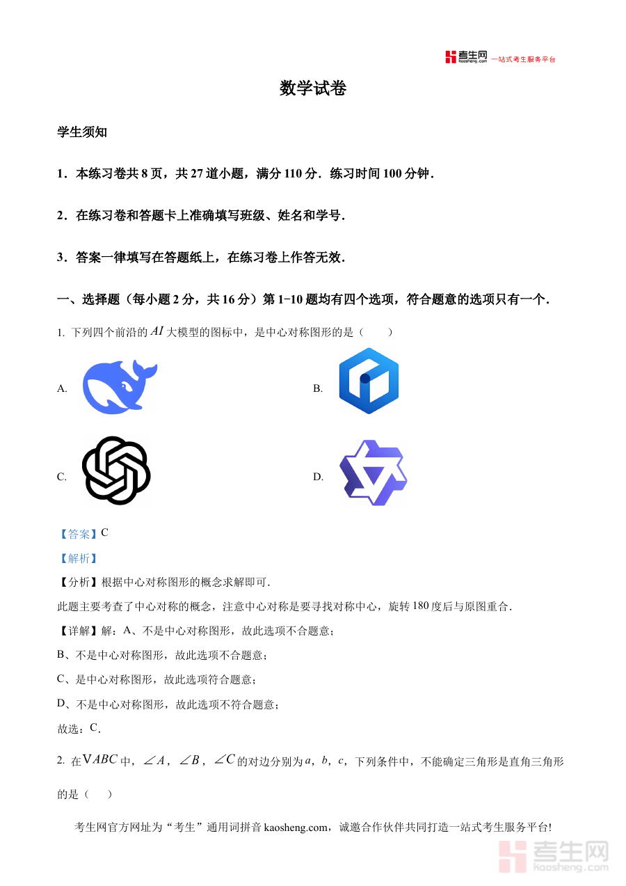 本资料适用于北京市第四中学2025-2026学年九年级学生,也可作为数学教师了解学生开学初期学习状态的辅助工具,其解析内容有助于学生明确自身知识薄弱点,提升阶段学习的针对性与效率,为后续数学学习与备考奠定坚实基础。