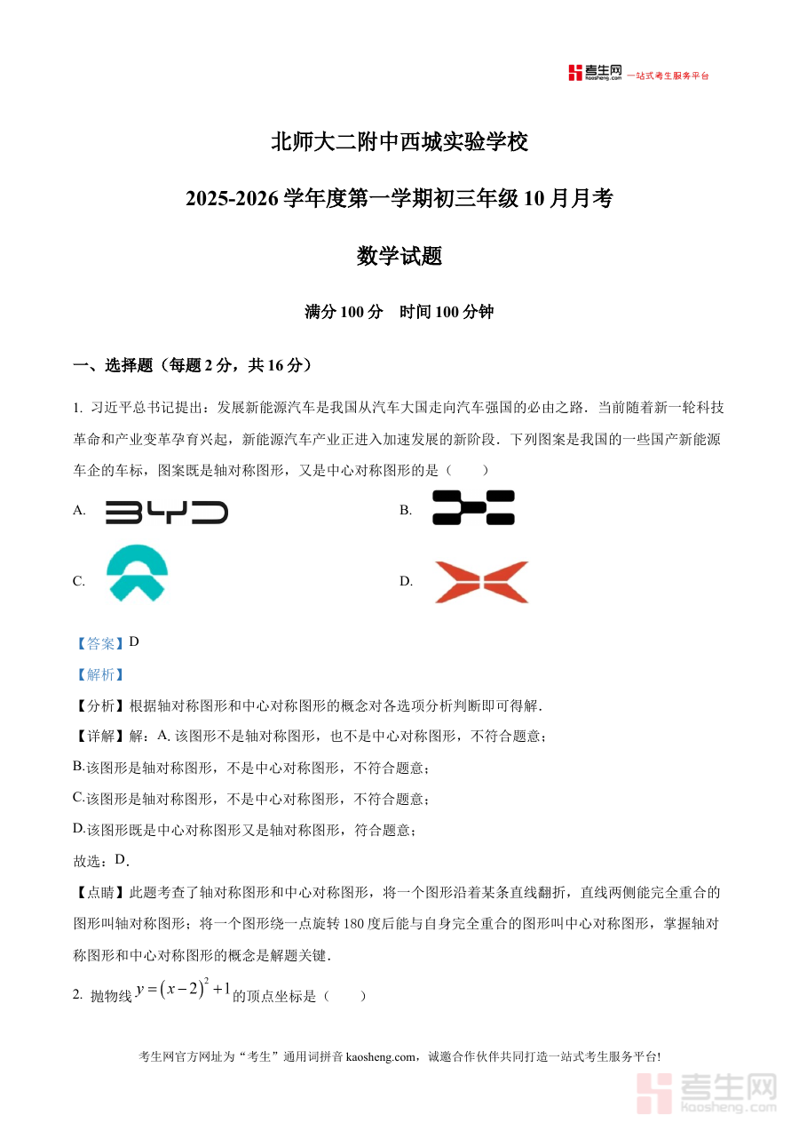 《精品解析:北京师范大学第二附属中学西城实验学校2025-2026学年九年级上学期10月月考数学试题(解析版)》是针对2025-2026学年北京师范大学第二附属中学西城实验学校九年级上学期10月数学月考的专业备考资料。该资料聚焦该校该阶段数学月考的考查需求,以解析形式呈现试题相关内容,为使用者提供与本次月考直接关联的参考依据,帮助其快速了解考试的整体框架和评价方向,是贴合该校学情的阶段性备考资源。