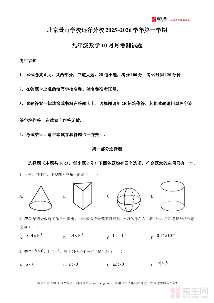 《精品解析:北京景山学校远洋分校2025~2026学年上学期10月月考九年级数学测试题(原卷版)》是针对北京景山学校远洋分校特定学年学期、特定时间节点的数学学科备考资料,聚焦该校九年级学生在2025-2026学年上学期10月月考的数学考查需求。作为原卷版资料,它完整保留了该校本次月考数学测试题的原始呈现形式,为使用者提供了与实际考试场景高度一致的备考载体。