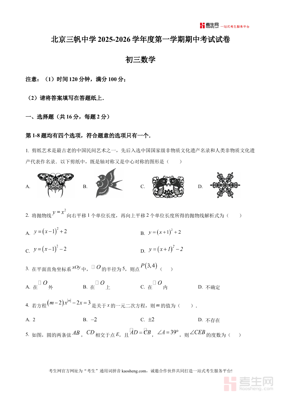 《精品解析:北京市三帆中学2025-2026学年九年级上学期期中数学试题(原卷版)》是针对北京市三帆中学2025至2026学年九年级上学期期中数学考试的备考资料。该资料以学校官方期中数学试题的原卷形式呈现,保留了考试的原始结构与内容框架,为使用者提供了贴近真实考试场景的试题资源,有助于使用者直观感受该校期中数学考试的整体布局与命题风格。