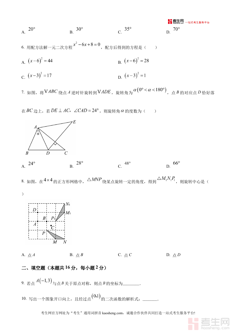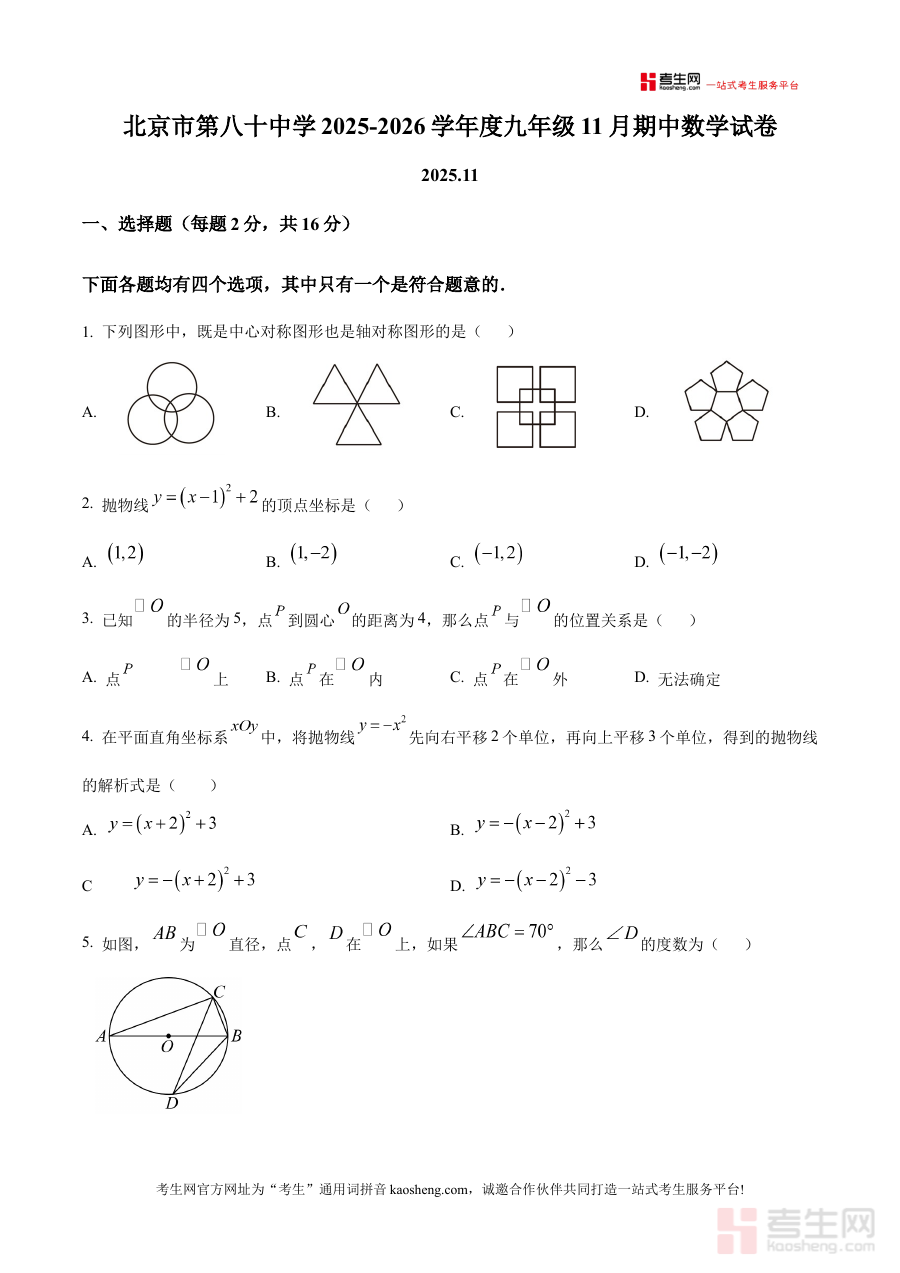《精品解析:北京市第八十中学2025-2026学年上学期九年级11月期中数学试卷(原卷版)》是针对北京市第八十中学特定学年学期的九年级期中数学考试编制的备考资料,其覆盖2025至2026学年上学期的时间范围,对应11月的期中检测节点,属于九年级阶段数学学科的阶段性考试资料。