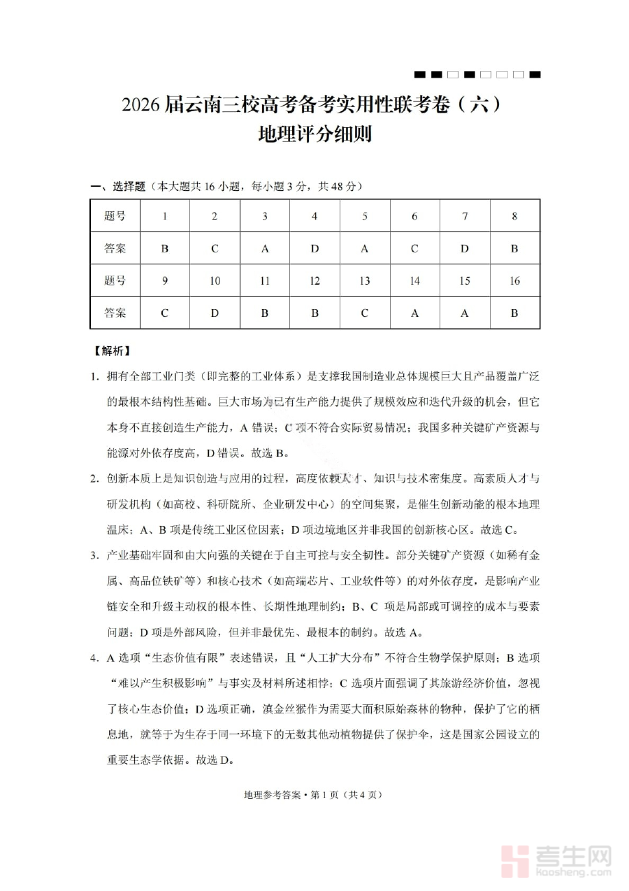 《2026届云南三校高考备考实用性联考卷(六)地理答案》是针对2026届云南地区三所学校联合组织的高考备考实用性联考第六次考试所配套的地理科目答案资料。该资料与本次联考的地理试卷直接对应,是高考备考阶段的重要辅助材料之一,旨在为考生和教学人员提供准确的答题参考依据,助力备考工作有序推进。