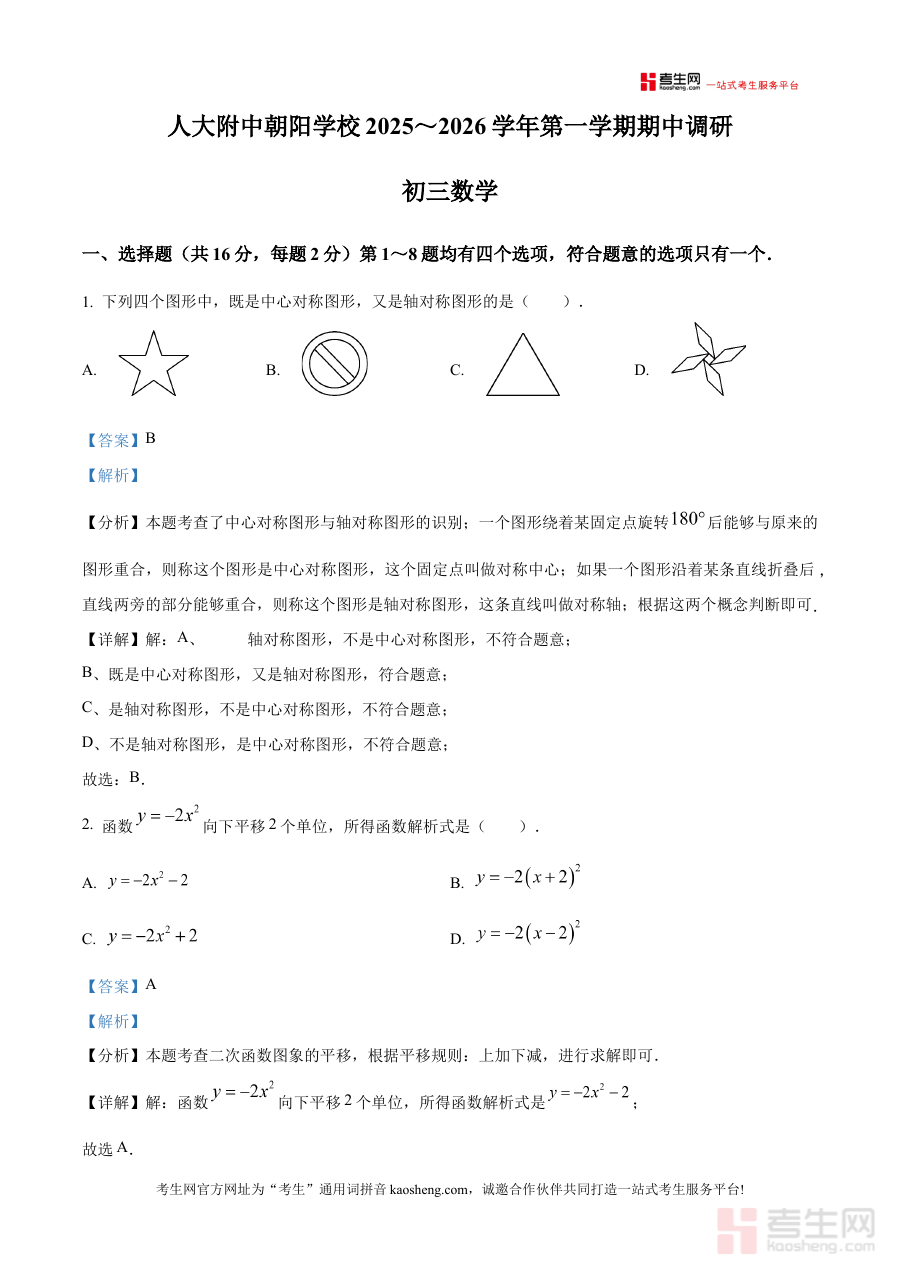 《精品解析:北京市中国人民大学附属中学朝阳学校2025-2026学年九年级上学期期中考试数学试题(解析版)》是针对北京市中国人民大学附属中学朝阳学校2025-2026学年九年级上学期数学期中考试的专项备考资料,覆盖该阶段数学学科的阶段性考查需求,为使用者提供与本校期中考查方向高度匹配的学习参考。