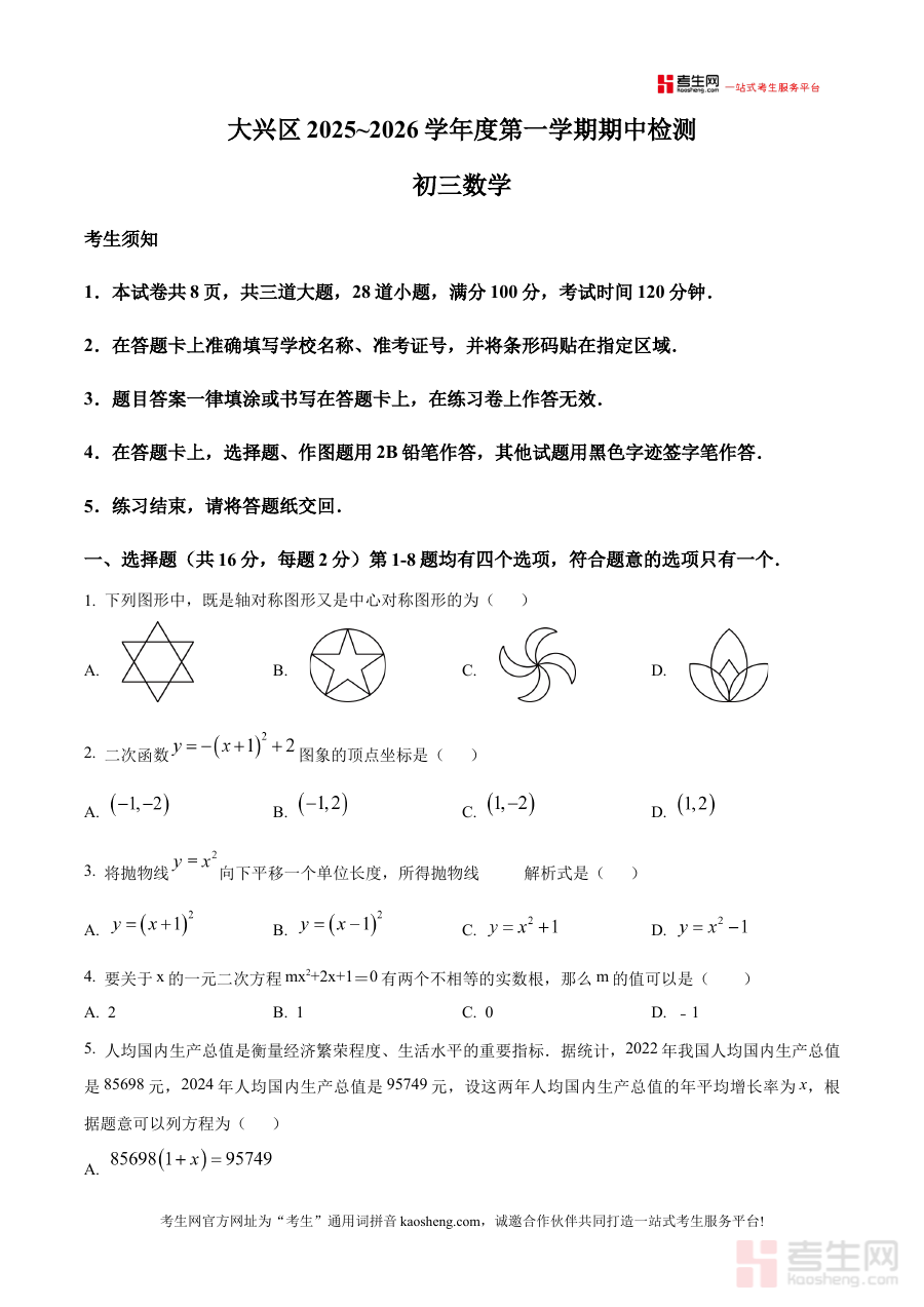 《精品解析:北京市大兴区2025-2026学年九年级上学期11月期中数学试题(原卷版)》是针对北京市大兴区特定学年九年级上学期11月期中考试的数学学科原卷资料,属于区域阶段性考试的核心备考资源。该资料严格贴合本地教学进度与考试要求,能够为相关师生提供与实际考试形式高度一致的参考载体,反映该阶段数学学习的考察方向及本地命题的基本特点,是衔接九年级上学期前期学习与期中检测的重要资料。