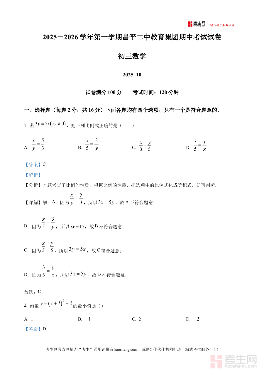 《精品解析:北京市昌平二中教育集团2025-2026学年上学期期中考试九年级数学试卷(解析版)》是针对特定区域与学段的数学考试备考资料,明确覆盖北京市昌平二中教育集团范围内2025至2026学年上学期的九年级期中考试场景,精准对应该阶段数学学科的阶段性考查需求,为相关使用者提供了与实际考试高度匹配的参考内容,助力使用者提前熟悉考试的整体框架与考查方向。