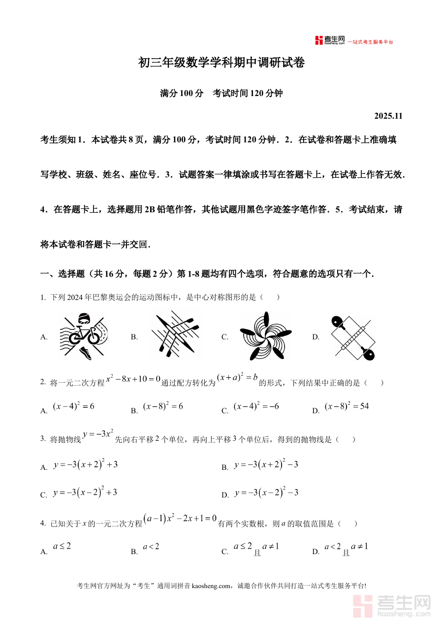 《精品解析:北京市朝阳区2025-2026学年上学期九年级数学期中调研试卷(原卷版)》是聚焦北京市朝阳区2025至2026学年第一学期九年级数学学科期中调研考试的专业备考资料,紧密贴合该地区九年级上学期数学教学进度与期中检测标准,为使用者提供与官方调研考试形式完全一致的原卷内容,是对接本地期中阶段数学考查要求的重要参考载体。